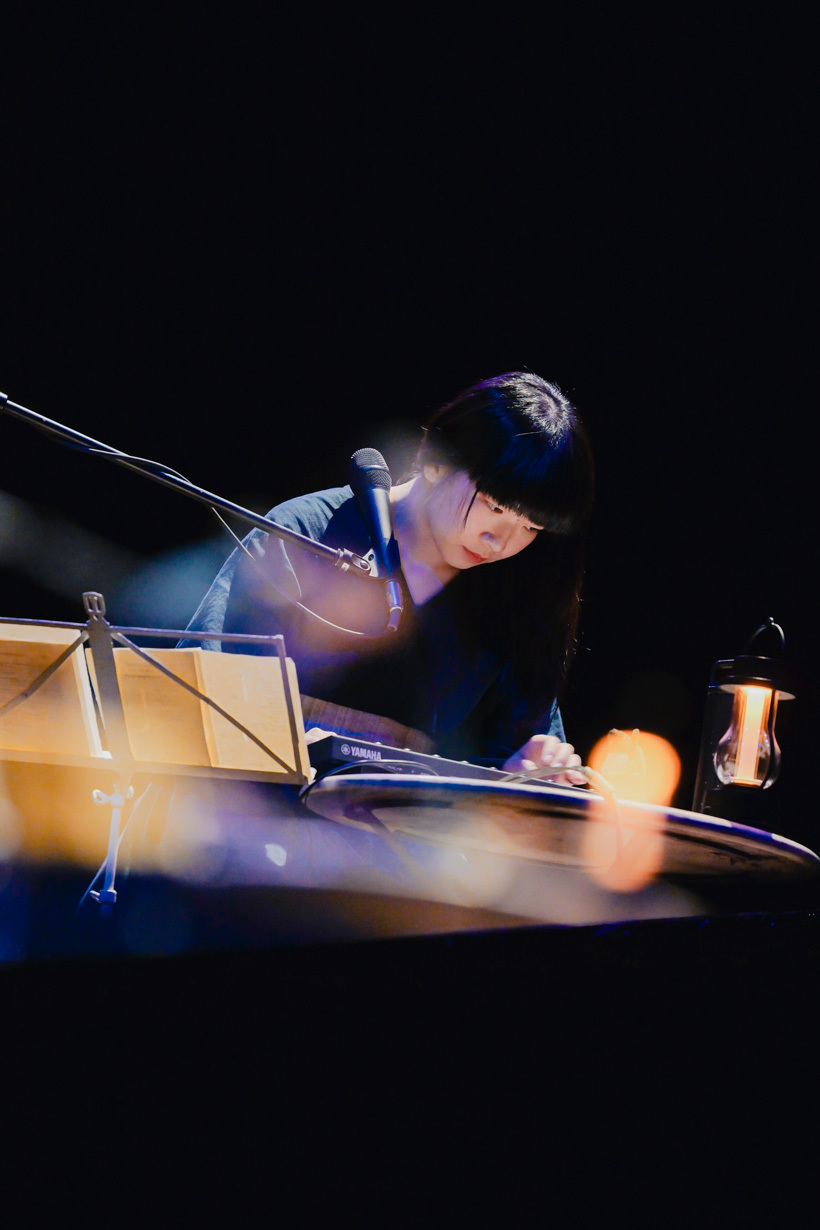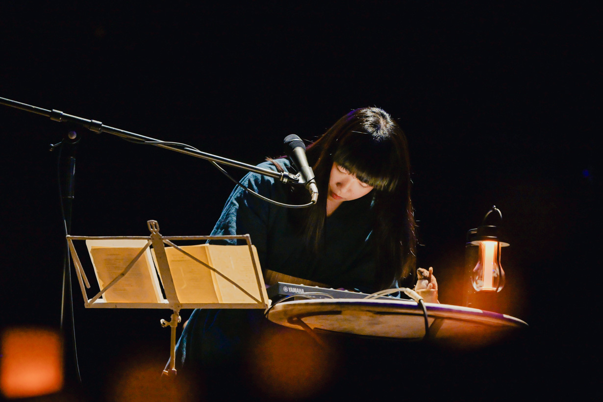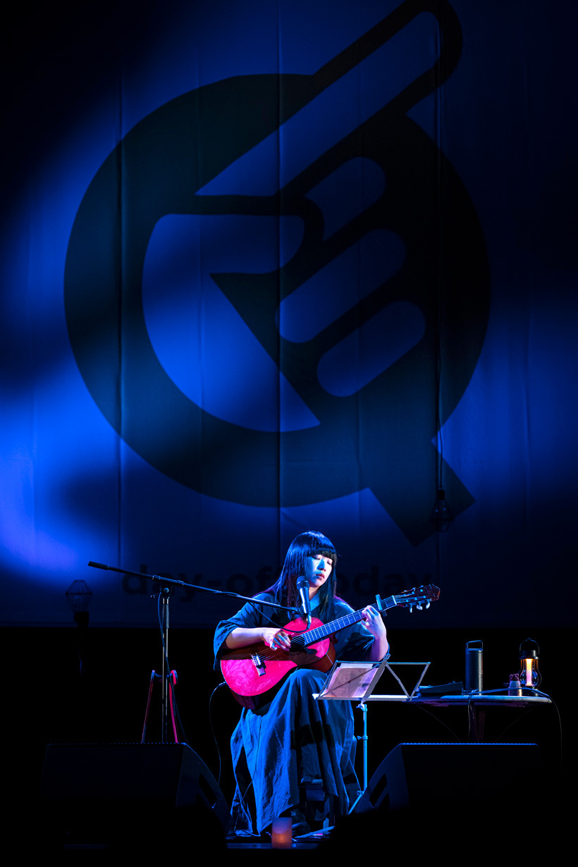 第一夜で全く書いていなかったが、沖縄でありながら2日間、かなりの大雨が降った。でも、特に青葉の音楽には雨のしっとり感が似あうように思う。そして、アニメーション『銀河鉄道の夜』を観た後に作ったという「アンディーヴと眠って」へ。曲終わり、外から聴こえる「サー……」という音について、青葉が「雨かな?」と触れる一幕も。歌と雨が同化したロマンチックな環境の中で、「海辺の葬列」や電子ピアノで鳴らされた新曲も披露された。不思議や幻想という言葉を軽く飛び越えて、神聖な時間とすら感じられる。続いても電子ピアノで音をループして重ねていきながら「Space Orphans」へ。静けさの中、静かに鳴らされる。