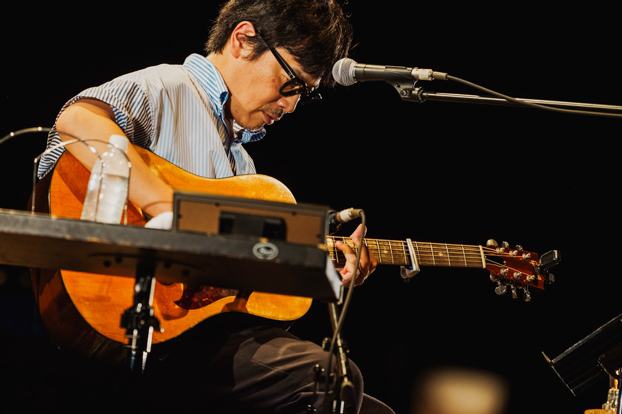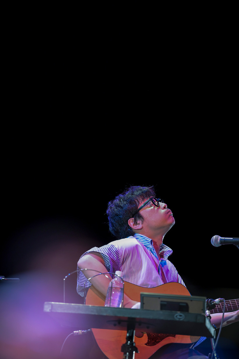 ここからは「琥珀色の街、上海蟹の朝」「言葉はさんかく、こころは四角」とくるりの楽曲が続く。沖縄だからこそのカバー楽曲、そして、くるりのオリジナル楽曲を交互に聴けるというのは本当に贅沢すぎる。8月にはくるりのツアーで沖縄にも来ることもあり、「ひとりでしかできない曲を持ってきていて、ちょっと珍しいものをやりましょか」とカバー楽曲へ。充分にカバー楽曲を聴かせてもらっていただけに、次は何が歌われるのかとワクワクしていたら、岸田が高校の文化祭でコピバンして演奏したアメリカのハードロックバンドであるMR.BIG「To Be With You」! 1991年の世界的大ヒット曲だが、久しぶりに聴くとグッドメロディーであり、ドラマチックであり、今時の言葉で言うならばエモーショナルでもあり、本当に貴重なものを聴くことができた。