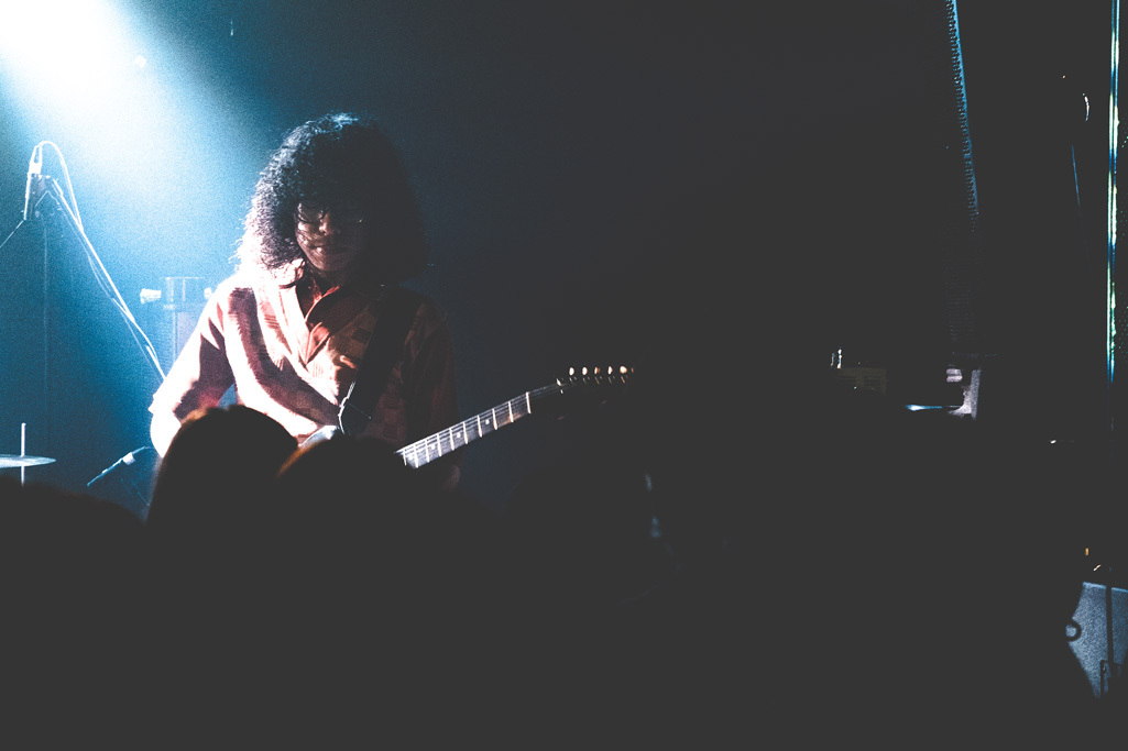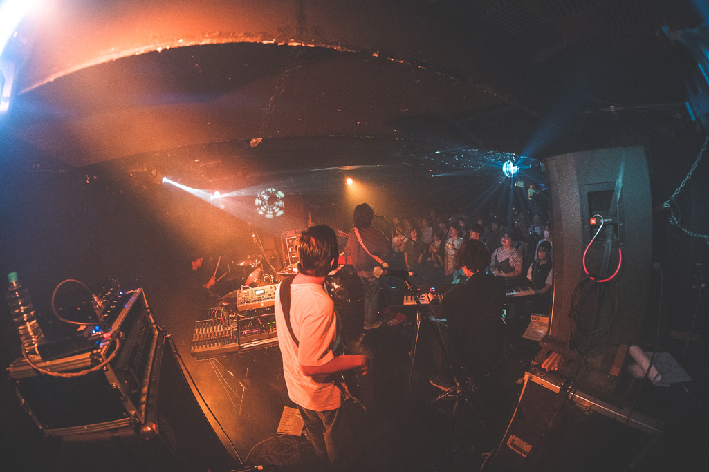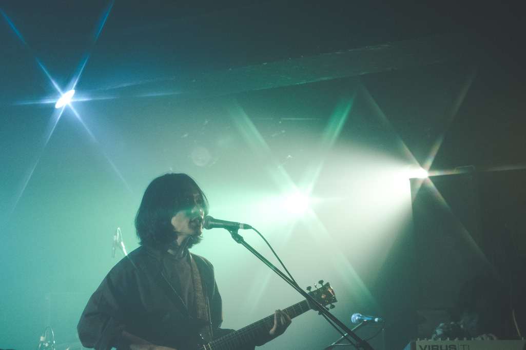 この日のアンカーを務めたのは、ゆうらん船。雨音を彷彿とさせる環境音がスピーカーから聴こえる中、永井秀和(Pf)がポツリポツリと音を鳴らす。後を追うように4人が放った乱雑なチューニング音も、気づけば伊藤里文(Key)が紡ぐ朧げかつ空間を支配するような音像によって一つに集約され、心地良さを生み出している。朝焼けをイメージさせる照明がステージに差し込み、「Waiting for the sun」でじっくりとショータイムはキックオフ。内村イタル(Vo.Gt)がフロア全体を見渡しゆうらん船のステージへと誘うと、ファンがアルコールを呷る手も進んでいく。