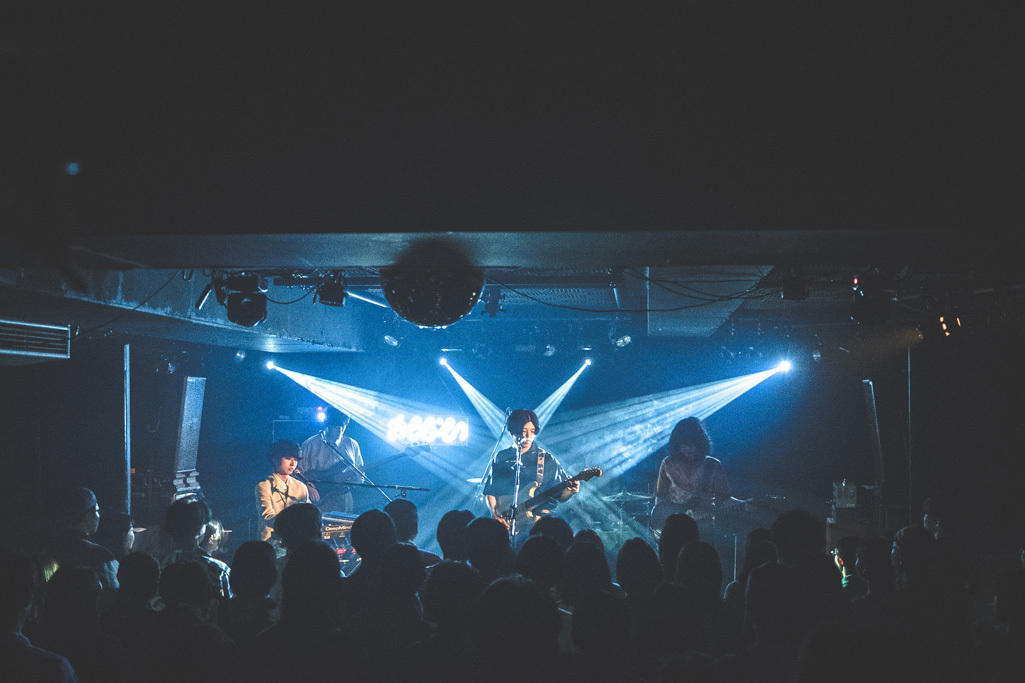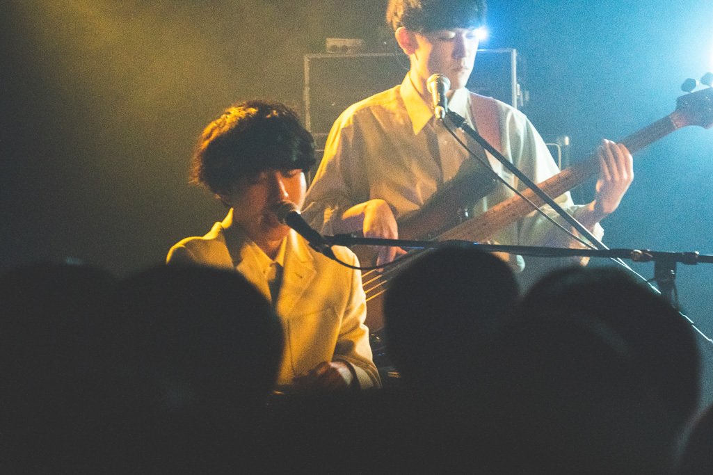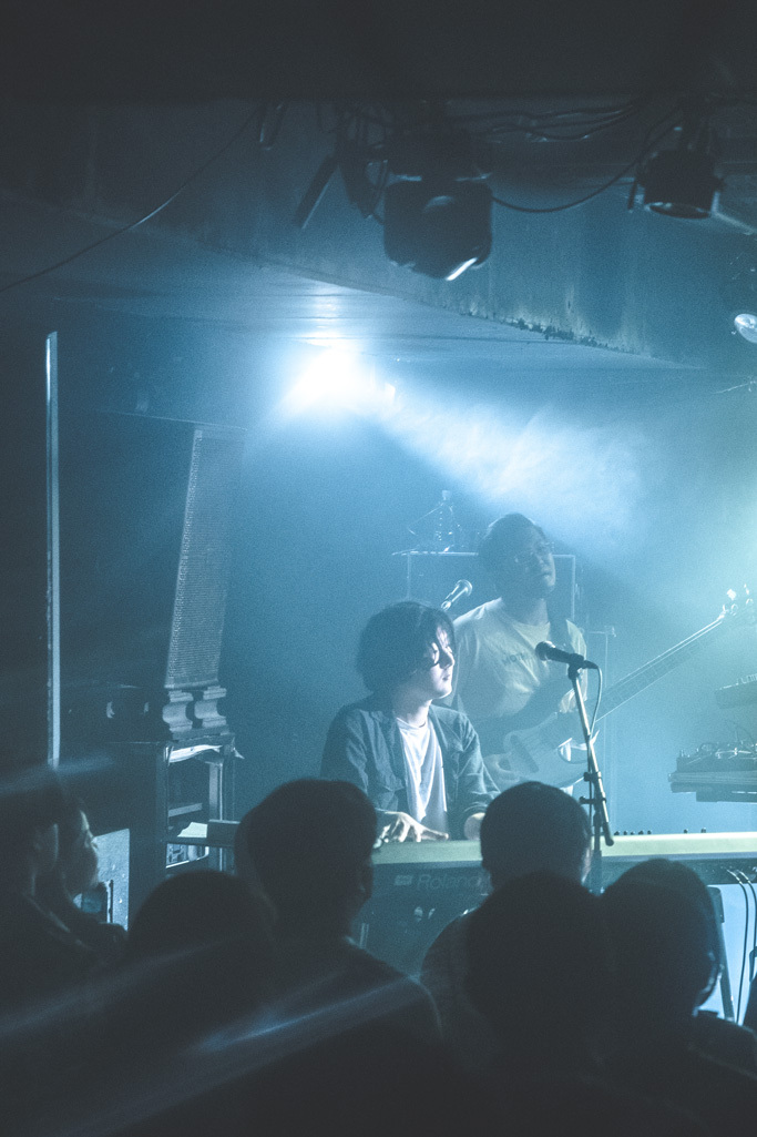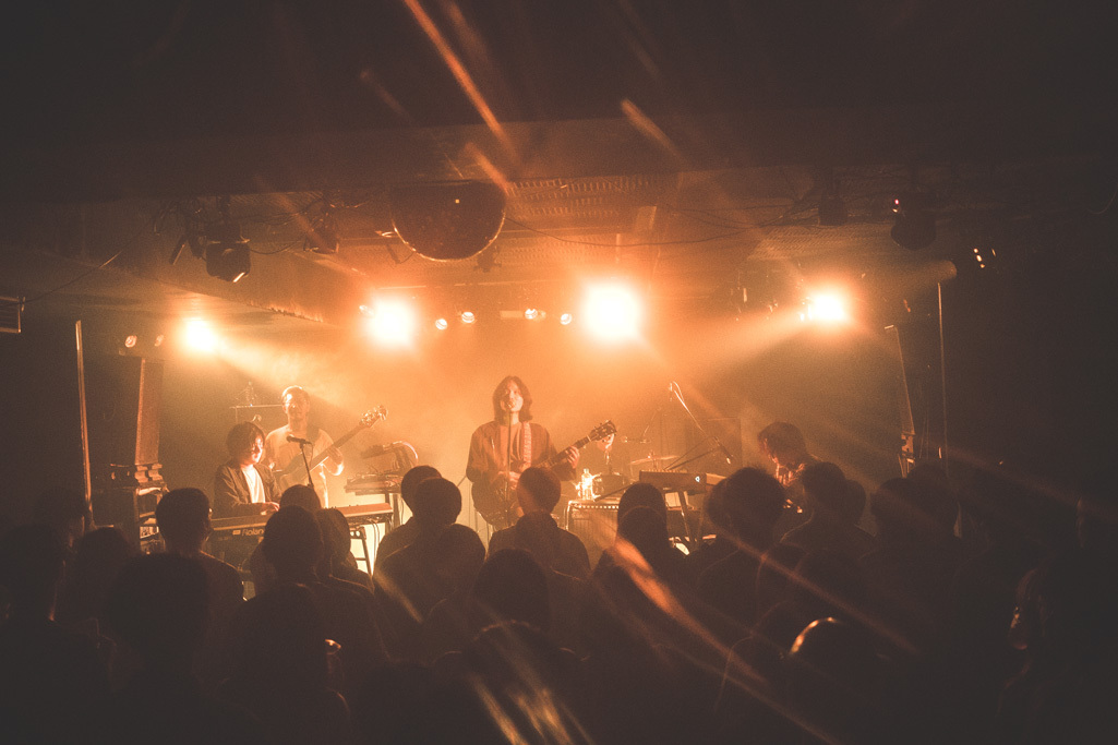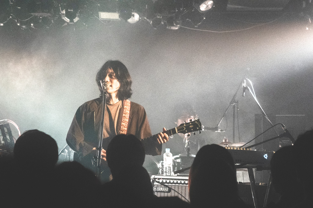 ライブはアルバムの最終曲「宇宙飛行士の恋人」でスタート。オーロラを想起させるようなムービングライトの光が降り注ぎ、壮大なスケール感を初っ端から見せつける。物憂げな奥中康一郎(Vo.Gt)の声色と石嶋一貴(Key)のコーラスが会場をうっとりとさせた「Dance Alone」からセッションへと突入すると、石嶋が奏でる浮遊感漂うサウンドが全身を包む中、神谷幸宏(Dr)のプレイも熱を帯びボリュームを上げていく。親指弾きから生まれる丸みを帯びたベースサウンドを鳴らしていた赤塚舜(Ba)も気づけば、パワフルな音で神谷と共にタイトなリズムを形成している。雪崩れ込んだ「TAPIR」では、石嶋のピアノソロから奥中がビブラートを効かせた豊潤なギターソロを響かせ、ここまでのゆったりとした雰囲気を一変させた。