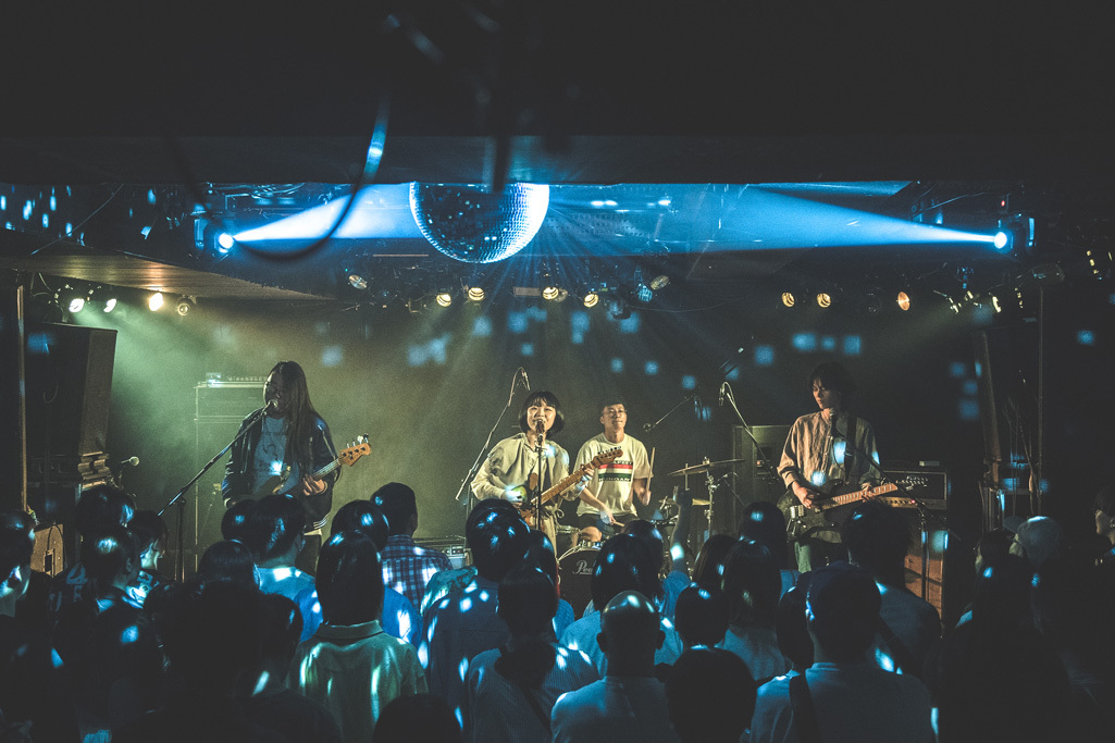 4月に開催されたワンマンライブに触れ、コンスタントに大阪を訪れることができている喜びを語ると、奥中が4人と目を合わせゆっくりと頷いた。ブレス音さえ聞こえる静寂からドロップされたのは「ハイウェイ」だ。神谷が刻む軽快なビートと比志島國和(Gt)のカッティングがオーディエンスの肩を揺らしていく。<誰かになれない僕のままで 許していけるのだろうか>と揺らぐ自己の存在を歌いあげるサビで回り始めたミラーボールの光は、街灯の明かりが後ろへと流れていく高速道路の光景を呼び起こした。