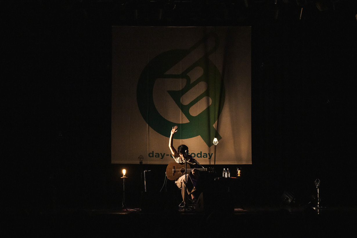 「さびしさ」はホーミーを彷彿とさせる発声法だと勝手に考えていたら、その声がループされ、そこにギターの音色が乗っていく。<風よ このあたりはまだか>というメロディーラインが耳に残り、歌もギターも力強く響いている。最後の楽曲は立ち上がって、6月発表の新しいアルバム『呪文』から「ハチス」を歌う。