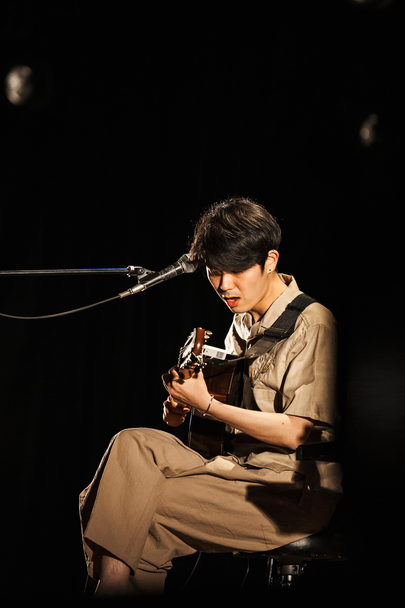 第一夜の先手は折坂悠太。両手をあげて堂々と登場すると歓声が起きるが、本人は少しためてから挨拶する。