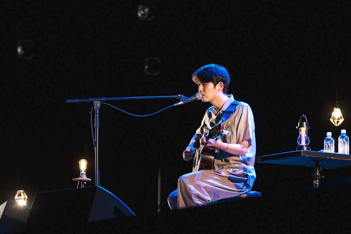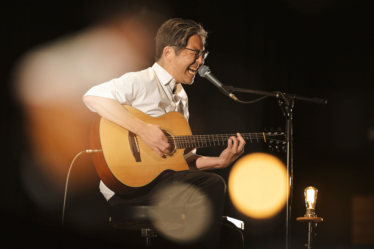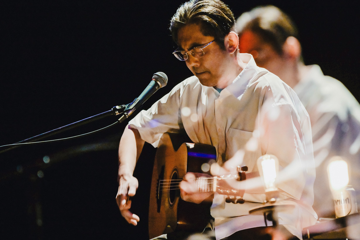 穏やかな口調ではあったが、しっかりと対局への闘志を感じることができた。客席は暗くなり、舞台だけが照らされると、伸びやかな歌声で「道」が歌われる。下手側のロウソクのようなライトが素敵に光っている。曲の終わりが近づいてきた<ゆけどゆけども>と歌われた辺りで、舞台後方に吊るされた幾つかの電球ライトが光り、折坂の横にある丸机に置かれた小さいロウソクのようなライト、舞台前方に配置された幾つかのスタンドライトなど全ての光が重なりロマンチックな空間を作り出す。