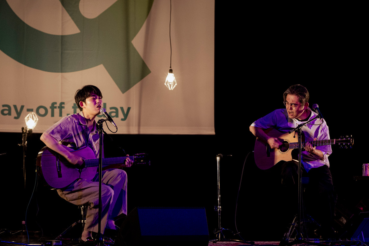 「冷静になる時もあるんですね、向井さんも」と折坂も感心していると、あのきらめくギターリフが向井から聴こえてくる。「全編にわたって歌って下さい!」と指示された折坂が歌うのは、THE TIMERS「デイ・ドリーム・ビリーバー」。最後にふさわしいハッピーエンドナンバー。終わり、向井は軽くピースをして、折坂と軽く肩を組んで去っていく。予定調和ではない、想定外の競演が観れた最狂の第一夜となった。