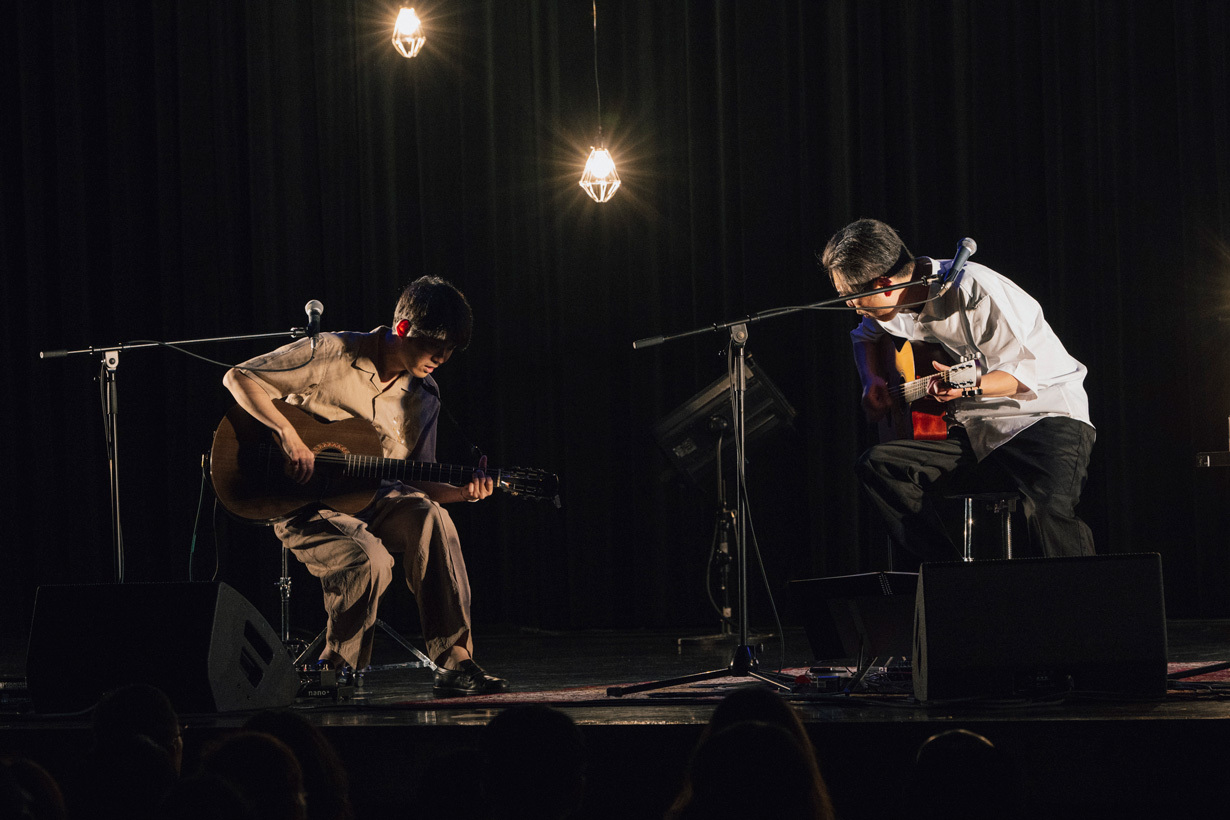 アンコール。向井のギターと椅子の下手側にもうひとり分のスペースが作られている。「千葉県流山市からお越しの~~」と向井は紹介して、「千葉県流山市からひねくりあがってやって参りました」と折坂が応える。向井の横に片膝を立ててしゃがむ折坂の姿は最早臨戦態勢であり、何が始まるかと心待ちにしていると、これまた向井らしい言い回しで「折坂さんのリクエストでナンバーガール〝ズ〟の大ヒット曲を」と発せられる。