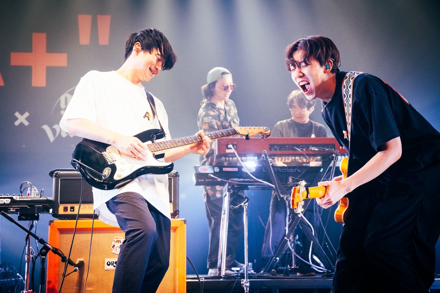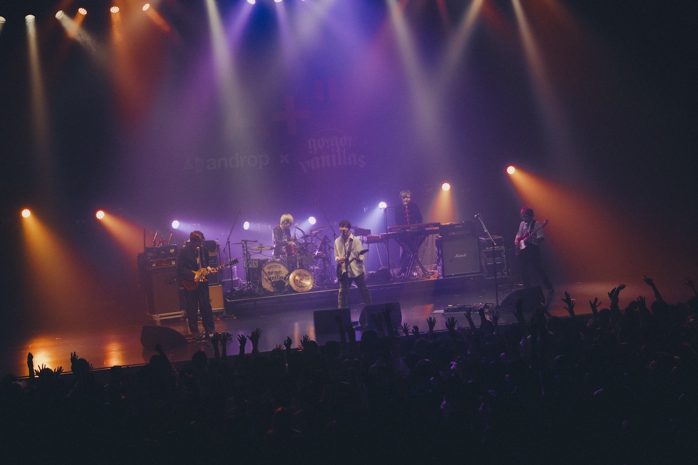 中盤からは様々な曲調を織り交ぜつつ、じわじわとボルテージを上げ続けていく展開に。ジャジーなコードに大胆な曲展開、ラップ調の歌やオルタナロック的なサウンドが入り混じるandrop流のミクスチャー「Tokio Staranger」を皮切りに、シンセポップ風味のダンスナンバー「Saturday Night Apollo」から繋いだ「SuperCar」は横ノリ系の楽曲ながらビートを強めたライブ感たっぷりの演奏で、ジャジーなシャッフルなどアレンジの妙でも唸らせる。さらに「今日を最強な1日にしましょう」の言葉とともに放った「Hyper Vacation」では、その突き抜けた陽性サウンドっぷりでイントロの段階からフロア中を波打たせたのだった。ちなみにandropファンが「バニラズファンに聴いてほしい」と選んだ1位がこの曲。最新作の曲が選ばれていること自体、何より今の彼らの充実ぶりを象徴しているようで素晴らしいじゃないか。
