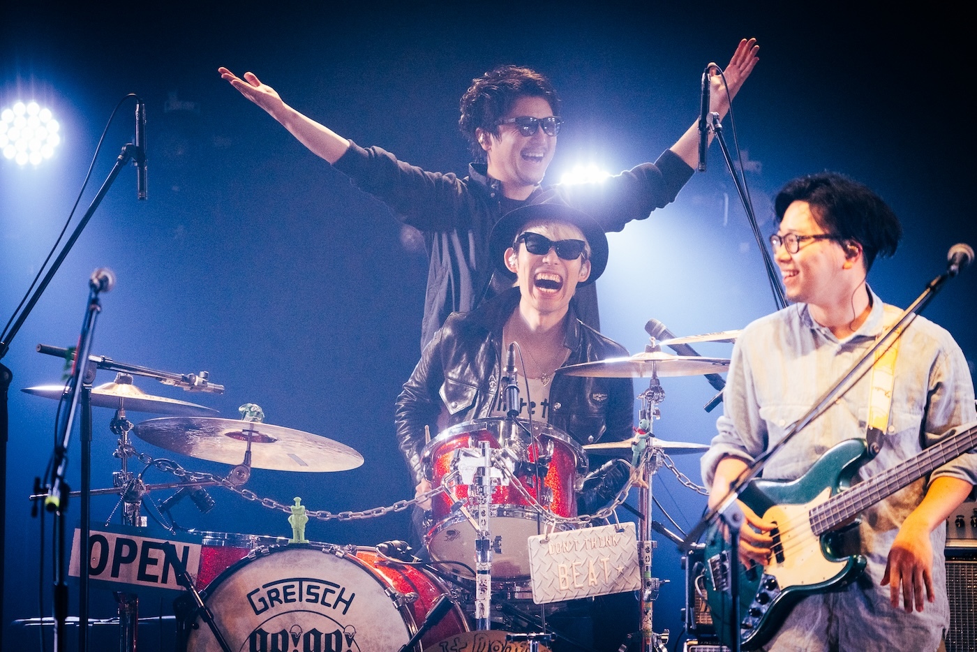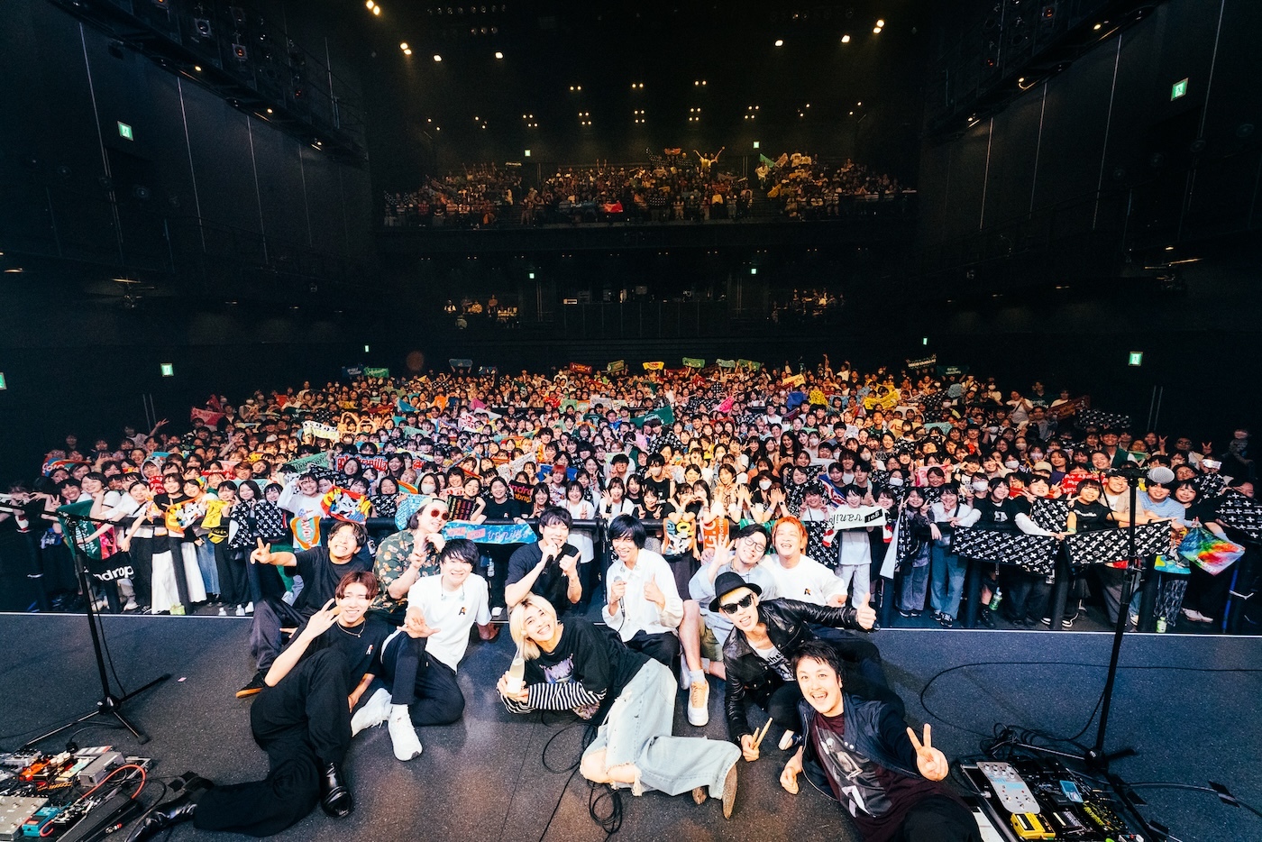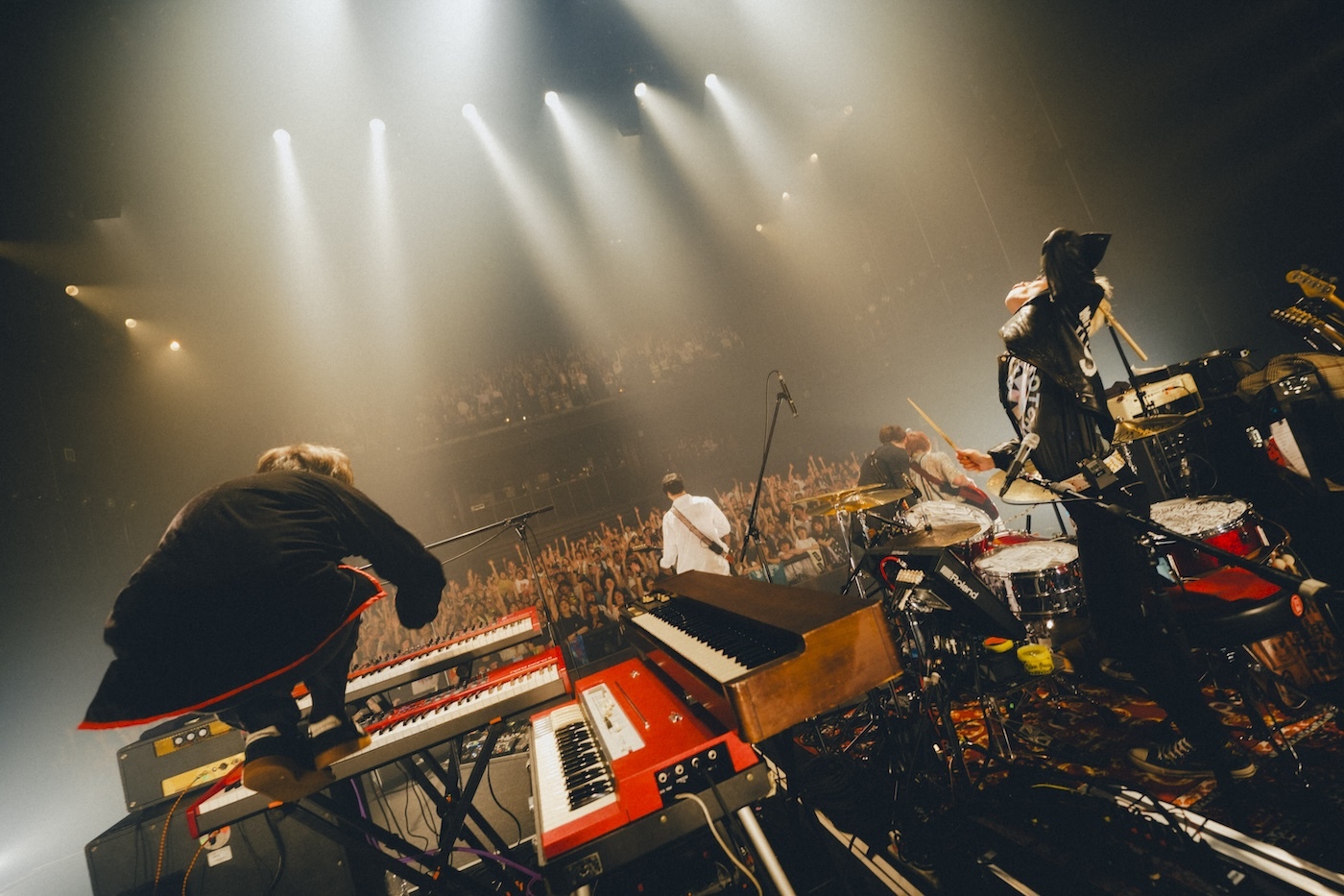 そんな両バンドの最大の共通点であるサウナにちなんだ曲として演奏されたのは、バニラズの「TTNoW」。各パートがツイン編成というだけでだいぶ賑やかな上、曲中で互いのドラムセットを行き来してみたり、逆にサポートキーボード2名は密着状態で連弾したりと視覚でも楽しませるお祭り騒ぎを経て、最後は生きていく日々に捧げる“乾杯の歌”として「Toast」をハートフルな演奏で届けてライブを終えた。