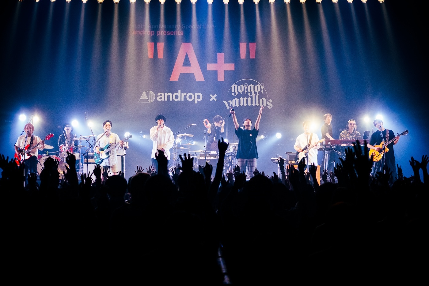 6月6日、EX THEATER。andropのデビュー15周年を記念して実現した、go!go!vanillasとの2マン。対バン実現のきっかけは両バンドのファンクラブがともにFanplusのサービスを利用していることであり、そのFanplusがスポンサーとなっているTOKYO FMのラジオ番組『FESTIVAL OUT』のパーソナリティーとして、両バンドと親交もある別府由来が開演前のDJと進行役を務めてのライブとなった。