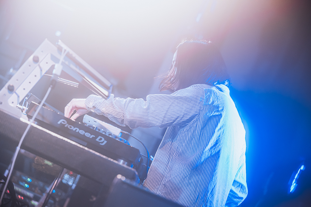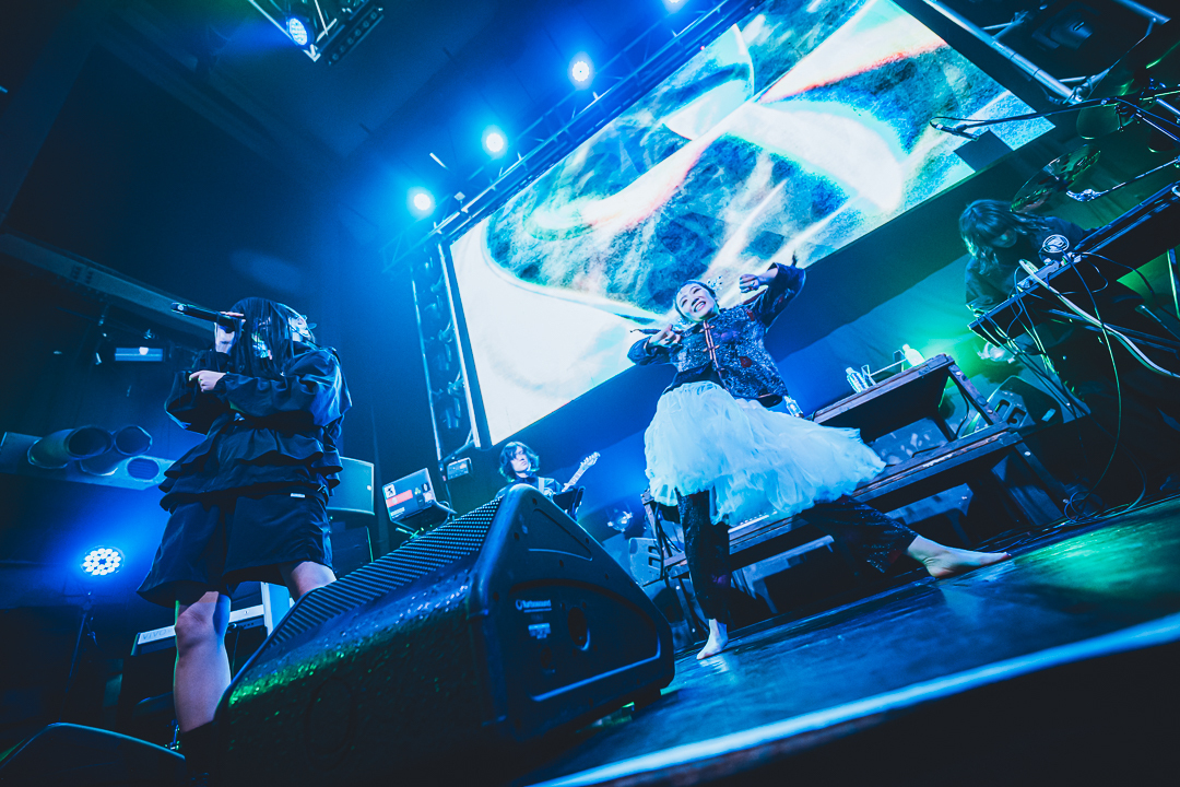 ステージには土器大洋(Gt,mani)と髙橋尚吾(Dr,sampler)も加わり、生音がダイナミックな抑揚をつける中、現れたいつか(Vo)は顔をシェードで隠した状態で踊り、歌う。1曲目はトライバルな「カンブリアダンス」。テンポよく3曲披露し、序盤で早くも6月26日にリリースとなる「メンタルワープ」なる新曲も飛び出し、初披露にも関わらずフロアからは盛大にクラップが起きていた。