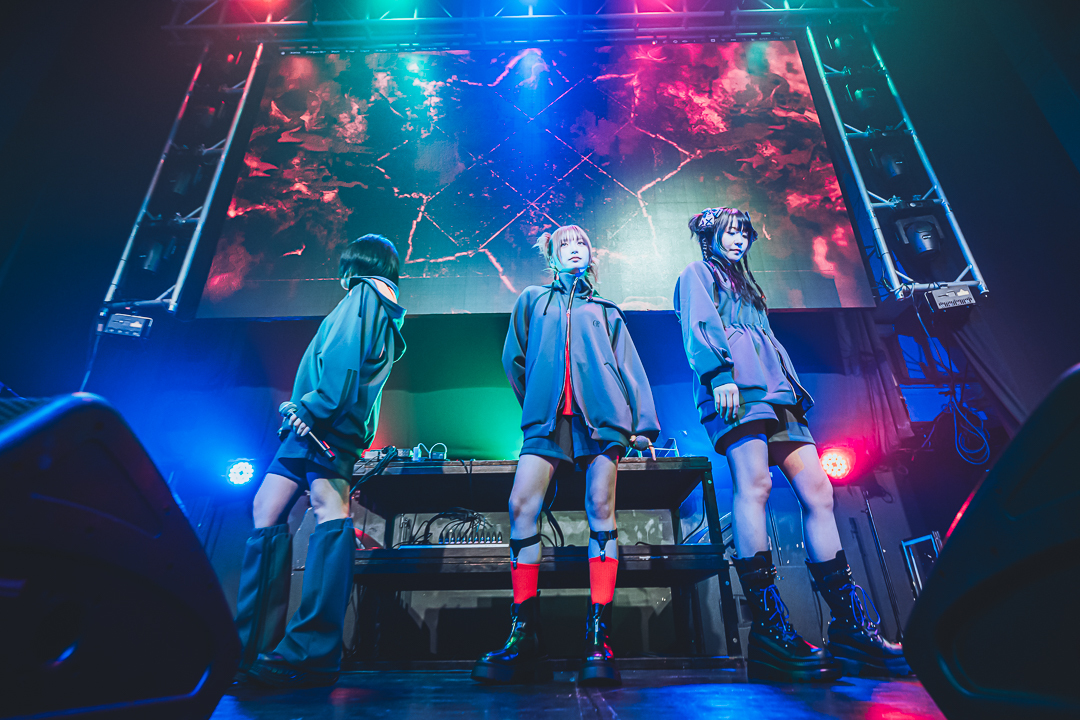 MCで全員が揃うと、大神纏(CV:吉田凜音)、安倍=シャクジ=摩耶(CV:SONOTA)、りむる(CV:をとは)をイメージして作られたハードでトライバルな「Siren」に突入。3人とも挑発的だが、声の個性の違いがパワフルさを増幅して迫ってくる。もちろん、攻撃的なだけじゃなく、アバンギャルドな飲み会(!?)の場面を彷彿させるをとはが歌う「焼ヶ鮭」でコール・アンド・レスポンスが起きたりもして感情が忙しい。ラストは代表曲でヘヴィなビートと3人の目まぐるしく変わるボーカルスタイルの「禁言」で鮮烈な印象を残した。