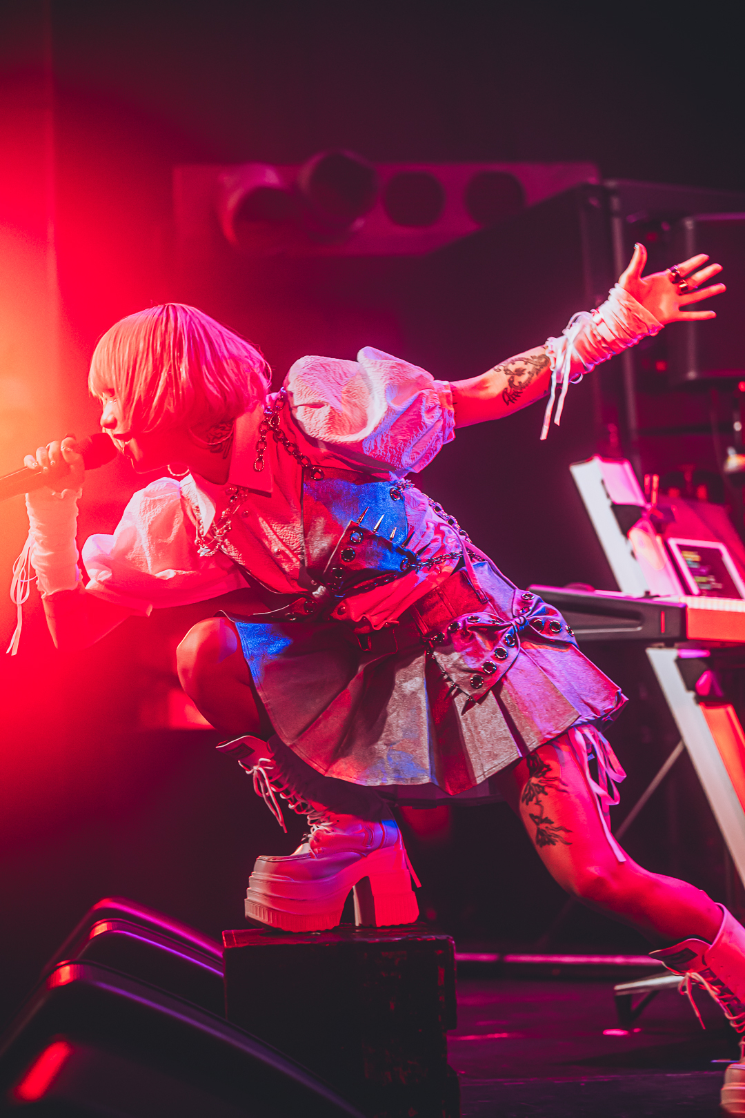 1曲目の「SUCK MY LIFE」からステージ前方に膝をつき、オーディエンスを見据えて歌う。狼煙のようなシャウトにこのライブへの意気込みが伺える。間髪入れずmaeshima soshiとの共作曲でエレクトロニックなポップチューン「ring ring, you kill me」で伸びやかなボーカルを響かせ、明るいメロディに乗る切実な歌詞が沁みる「0h G0D!!」、隙間の多いトラックがむしろ幼さと暴力性を綴るリリックをまっすぐ届ける「SAD night boi」と、序盤からヒリヒリした世界が続く。パフォーマーとして、聴き手に伝えようとする姿勢に今の4s4kiの強さを見た思いだ。
