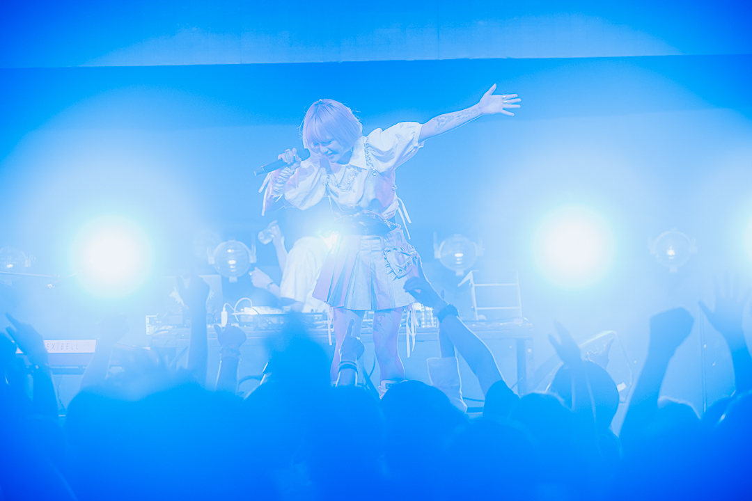 大事な人を守ってやれなかった後悔から一歩進もうとしている穏やかな「Railway」など、じっくり聴けるナンバーを続けたあと、「初公開の曲を聴いてください」と歌い始めたのは、ほぼ通しでファルセットの美しさが堪能できる「BLACK HIACE」というナンバーだった。一転して、maeshima soshiを紹介すると、ポップチューン「HONEY DARLIN」、ハードなハウス寄りの「Coconuts」でパフォーマンスもアグレッシブになり、サビではオーディエンスも続々ジャンプする盛り上がりを作り出し、ラストは秘密と現代的なイシューを掛け合わせた「Digital Tattoo」でユニークな言語感覚と特徴的なボーカルスタイルを印象付けたのだった。