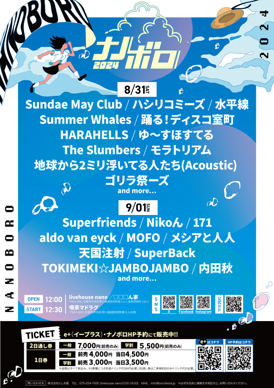 『ナノボロ』は、2002年から毎年11月ごろに開催されている『ボロフェスタ』のプレイベントにあたる音楽フェス。2007年よりLivehouse nanoなど複数会場で行われてきたが、2020年からは新型コロナウイルス感染拡大予防のため、屋内の京都KBSホールに場所を移動。2023年からは、Livehouse nanoと、□□□ん家、喫茶マドラグの3会場で開催されている。