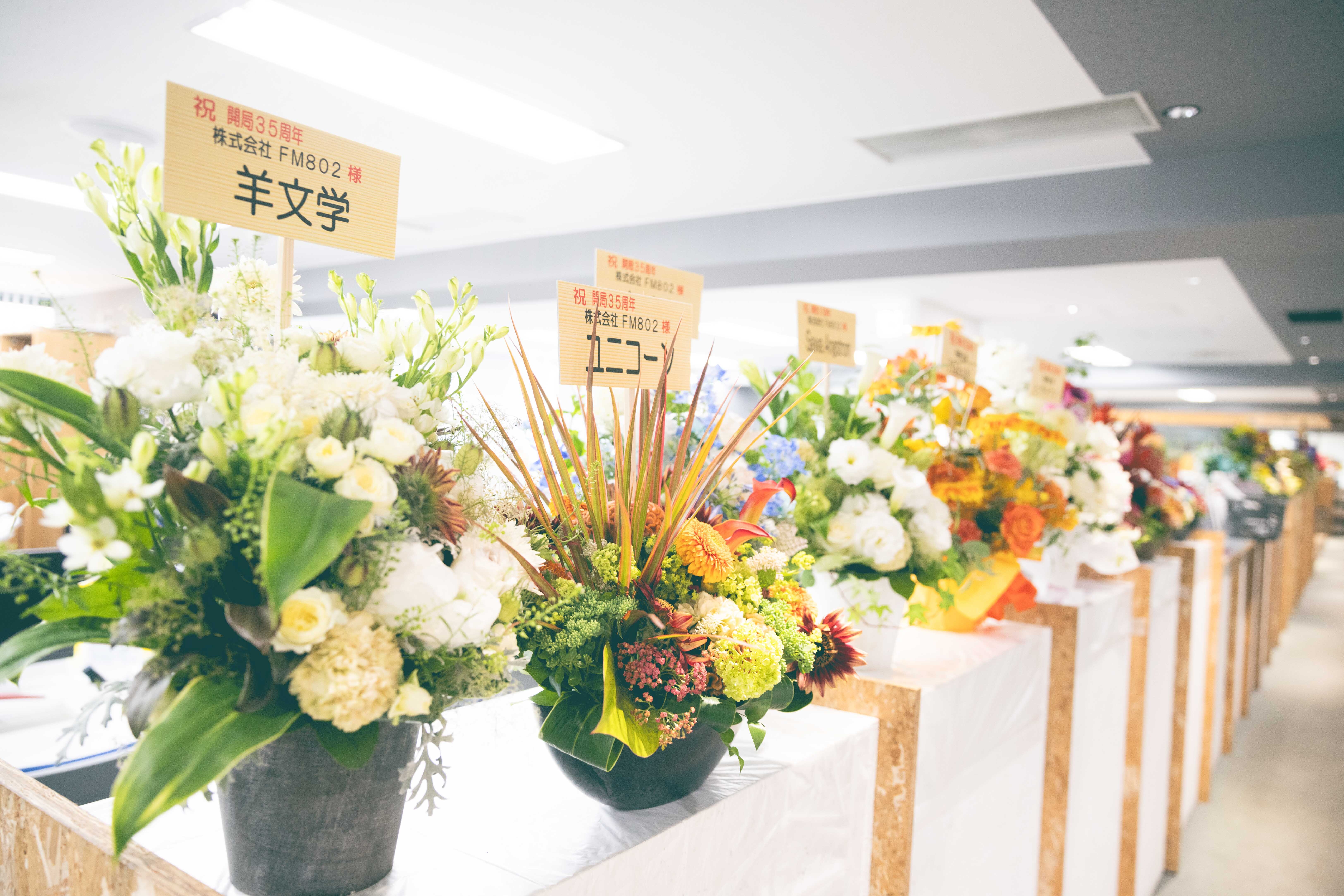 番組の進行中も、FM802には設置場所に悩むほどたくさんの祝花が到着。これまでに出演した多くのアーティストはもちろん、イベント会社や協賛企業の名が連なる様子からも、フェスやイベントなど、FM802がクリエイトしてきた幾つもの名シーンを思い起こさずにはいられない。