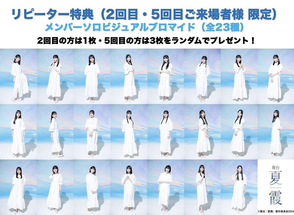 そして、何度も舞台に足を運んだリピーターの方への特典として、先着順にてブロマイドを配布することが決定。2回目・5回目に来場した方には「メンバーソロビジュアルブロマイド(全23種)」をランダムでプレゼント。なお来場回数によってもらえる枚数が変わり、2回目の方には1枚、5回目の方は3枚もらう事が可能。さらに7回目に来場した方には、「選べる!リピーター特典オリジナルブロマイド(1枚/全23種)」をプレゼントするとのこと(2回目・5回目の特典は同様のブロマイドとなる)。
