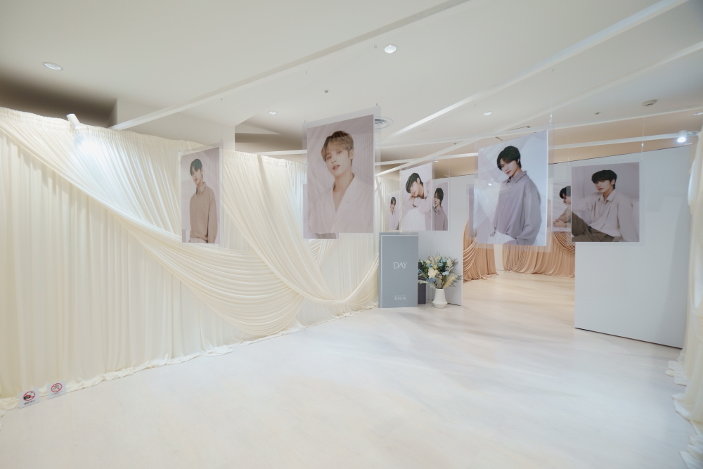 展示は「DAY」のパートからスタートする。爽やかな笑顔や温かい眼差しの写真が並ぶ。立体的に展示された写真の間をくぐり抜けながら奥へと進んでいくと、なんだか本当に彼らに囲まれているみたいでくすぐったいような。
