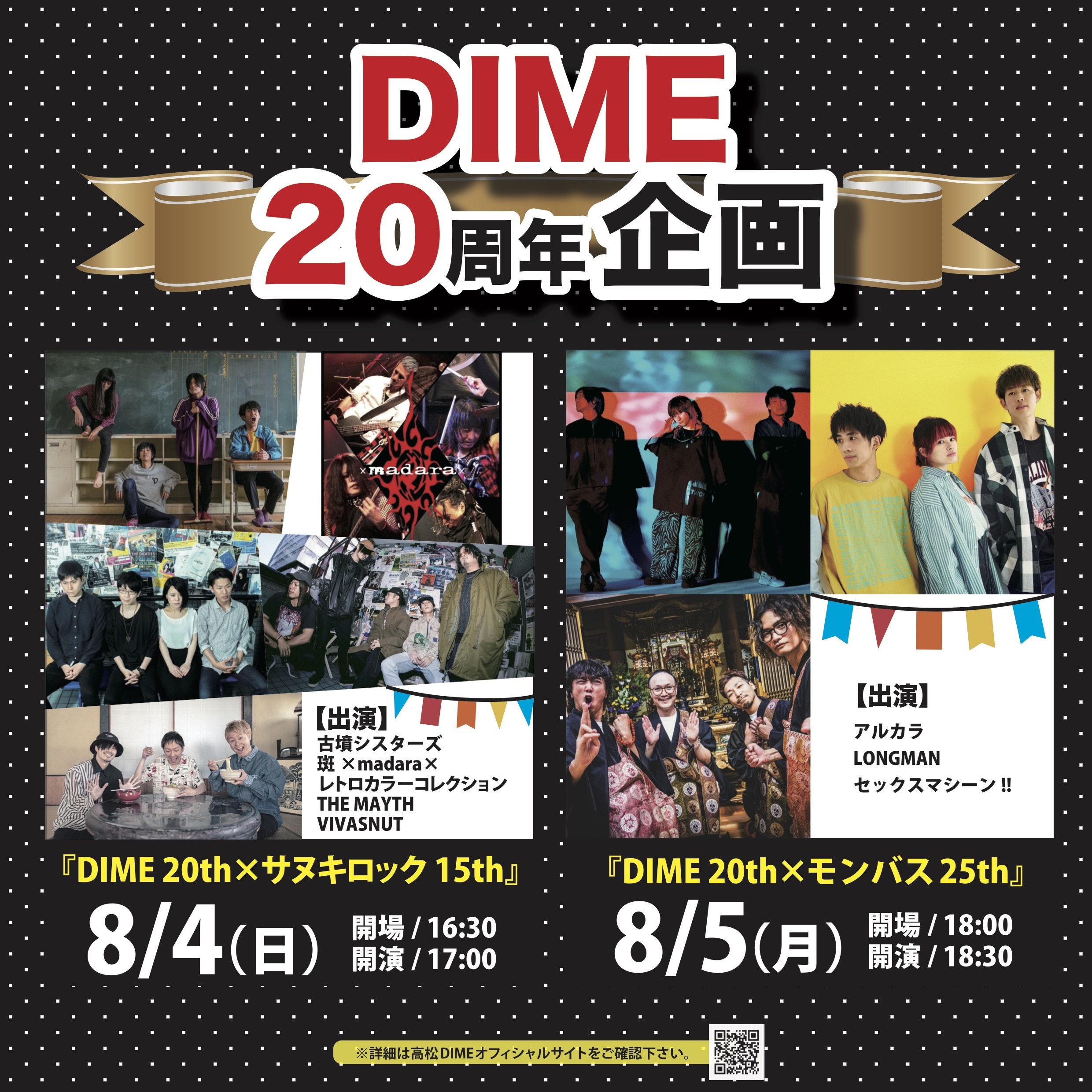 今年20周年を迎える高松DIMEの周年企画。8月4日(日)は『DIME 20th × サヌキロック 15th』と題して、DIMEのある商店街を舞台に繰り広げる街ごとライブサーキット『SANUKI ROCK COLOSSEUM』(サヌキロック)の15周年と合わせて開催。古墳シスターズ、斑×madara×、レトロカラーコレクション、THE MAYTH、VIVASNUTの出演が発表された。