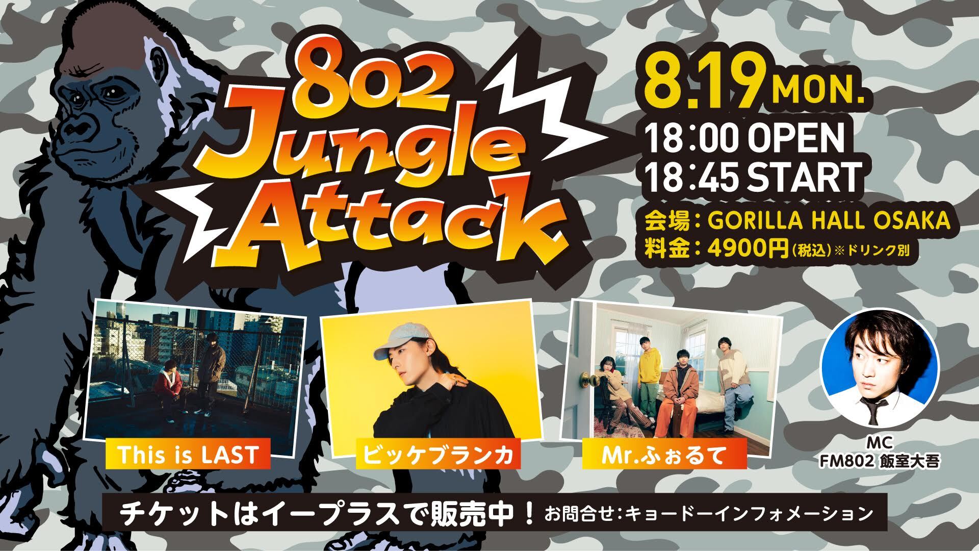 『802 Jungle Attack』は、大阪でのライブハウスカルチャーを推進すべく、FM802とGORILLA HALL OSAKA、イープラスによって立ち上げられた新プロジェクト。「ライブハウスはその街にとってカルチャーの発祥の地、そして音楽が好きな人にとってそこが一番の遊び場であるように……」と、ミュージックマンへの心地よい居場所を目指して誕生したライブハウス「GORILLA HALL OSAKA」が舞台となり、キャリアやメジャー、インディーズに関係なく、FM802のスタッフが自信をもってお勧めするオムニバスイベントとなる。
