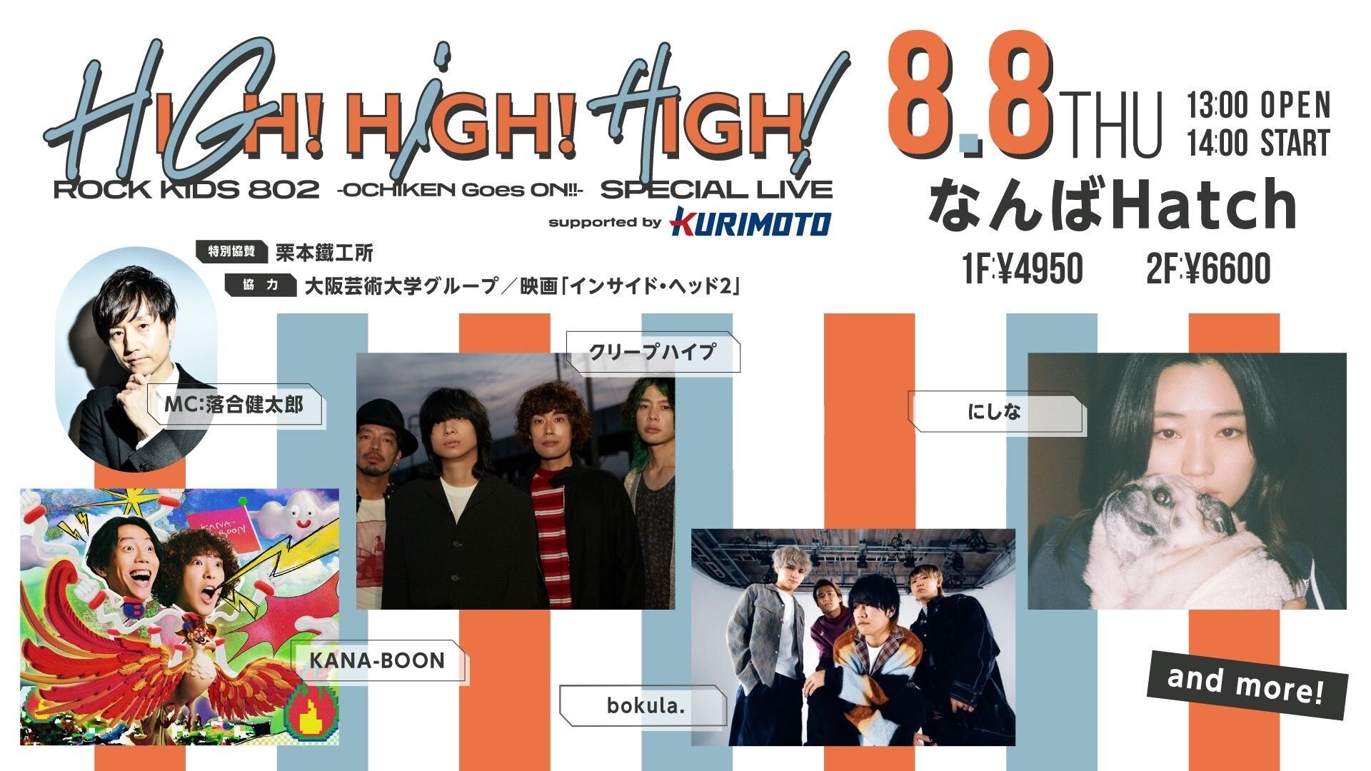毎週月曜から木曜夜21:00からFM802にて放送中の、リクエスト曲満載の生放送プログラム『ROCK KIDS 802-OCHIKEN Goes ON!!-』。恒例の番組発の夏のインドアライブイベント『HIGH!HIGH!HIGH!』が、今年もなんばHatchでの開催が決定。あわせてKANA-BOON、クリープハイプ、にしな、bokula.が出演することも発表された。