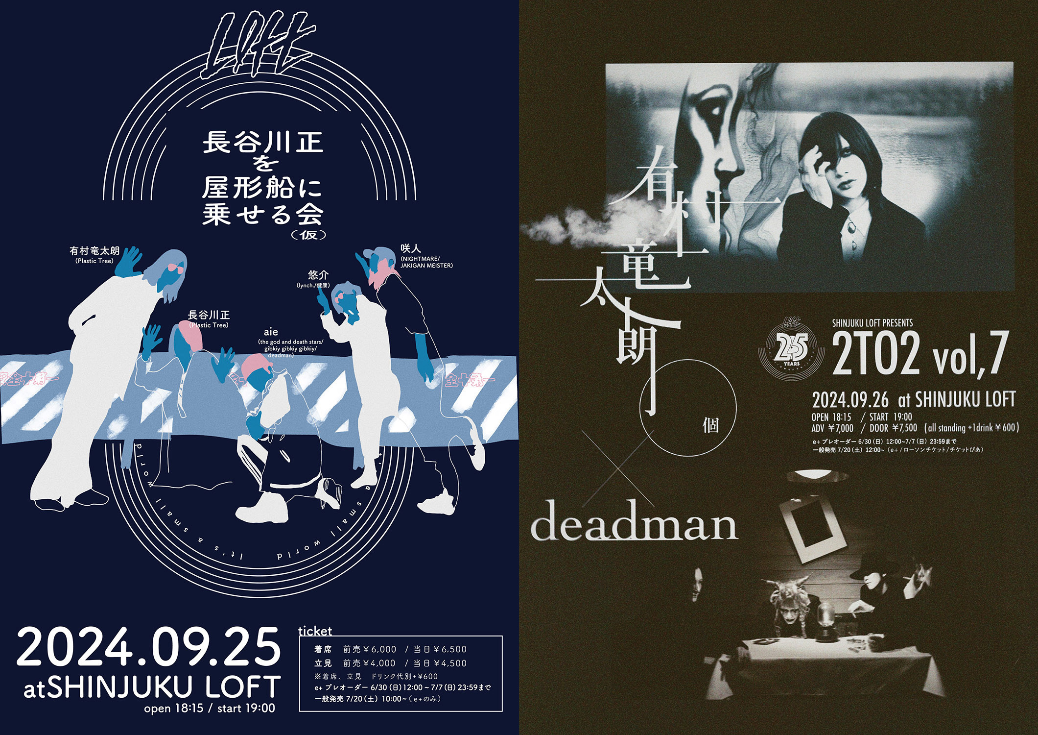 2024年9月25日(水)にトークイベント『長谷川正を屋形船ぬ乗せる会(仮)』、2024年9月26日(木)に、新宿LOFT歌舞伎町移転25周年記念『SHINJUKU LOFT PRESENTS 「2TO2 vol,7』有村竜太朗×deadmanの2マンライブ企画の開催が発表された。
