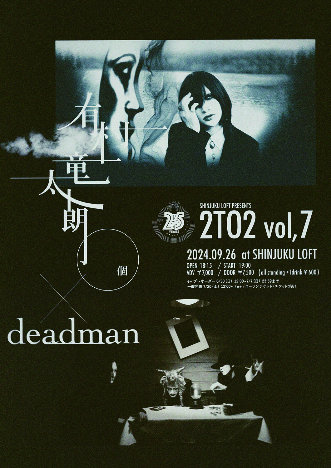 そして9月26日には新宿LOFTの歌舞伎町移転25周年企画として、有村竜太朗とdeadmanの初となる2マンイベントが開催。aie(deadman/Gt)の誕生日当日ということもあり、熱いライブが繰り広げられるのは間違いない。
