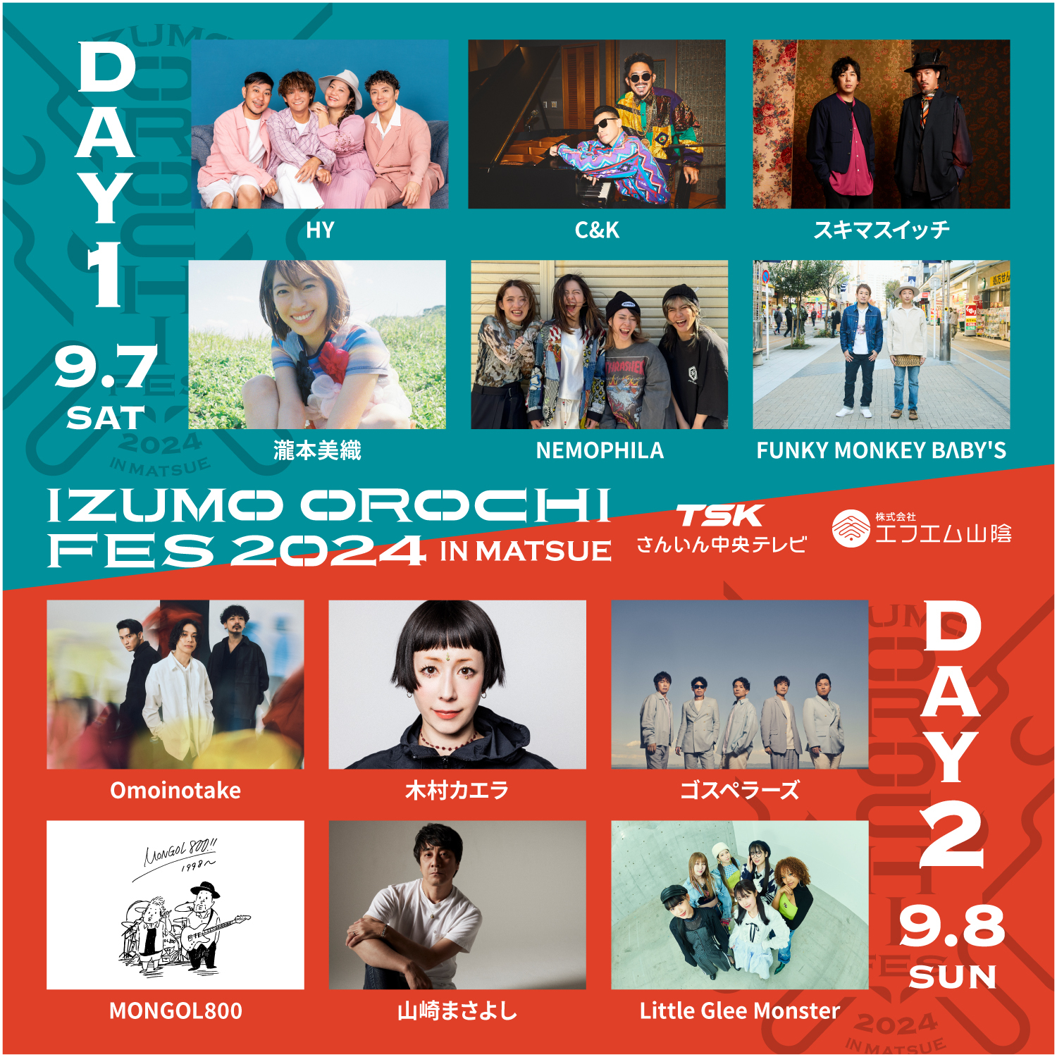 「音楽の力で島根を盛り上げる!」をコンセプトに開催され、地元山陰ゆかりのアーティストのほか豪華アーティストが出演。山陰勢は2024年TBSドラマ『Eye Love You』の主題歌を提供したOmoinotake(島根出身、8日出演)やNEMOPHILA(ギタリスト葉月が島根出身、7日出演)、瀧本美織(鳥取出身、同)が出演。山陰勢以外では、7日にHY、C&K、スキマスイッチ、FUNKY MONKEY BΛBY’S。8日に、木村カエラ、ゴスペラーズ、MONGOL800、山崎まさよし、Little Glee Monsterが出演する豪華ラインナップに。