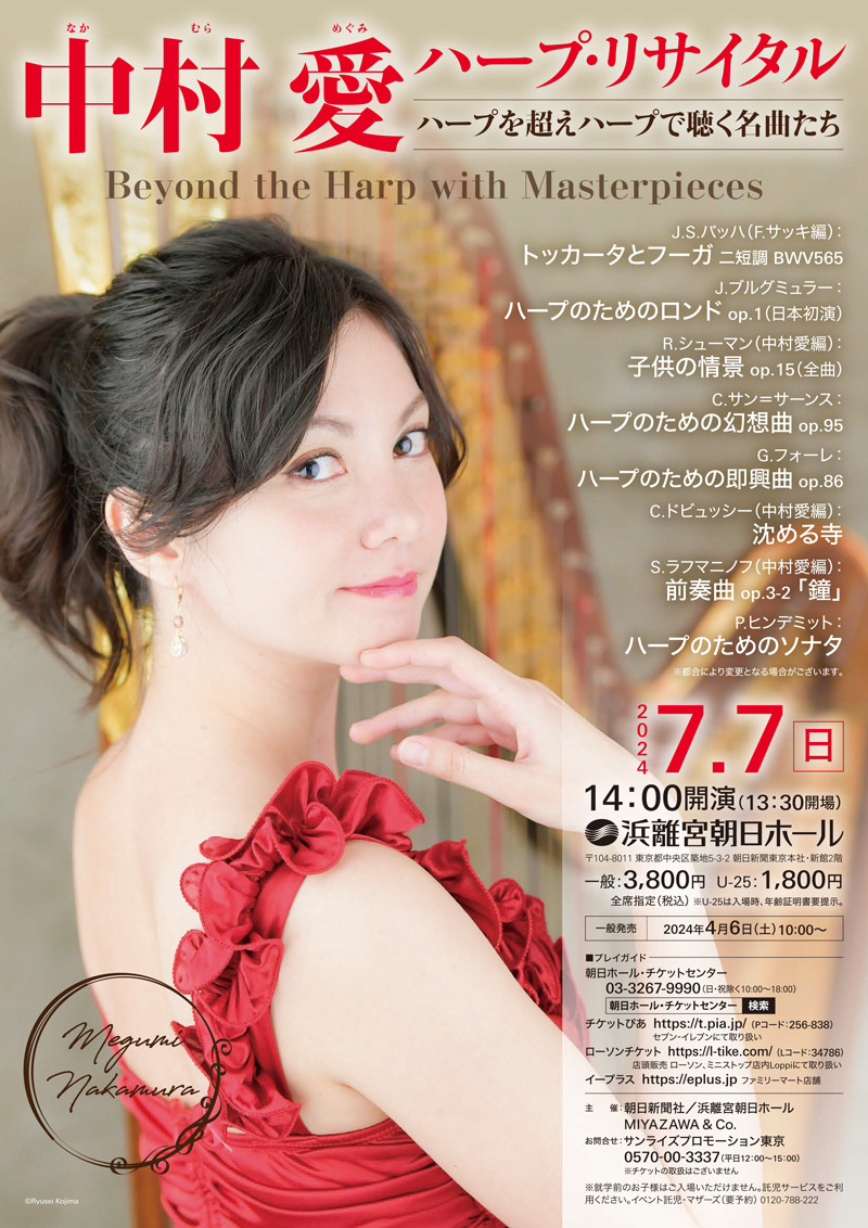 ハープ奏者中村愛(なかむらめぐみ)によるリサイタルが2024年7月7日(日)浜離宮朝日ホールにて開催される。