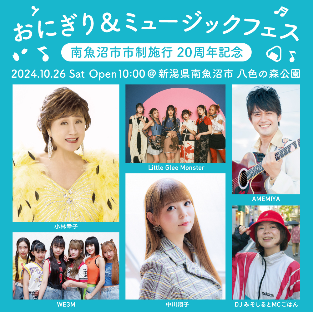 2024年10月26日(土)に新潟県南魚沼市・八色の森公園 ステージ八色の森にて、『おにぎり&ミュージックフェス』が開催される。このイベントは、南魚沼市市制施行20周年記念として行われ、一般社団法人おにぎり協会の「おにぎりサミット」の地方版も初開催が予定されている。