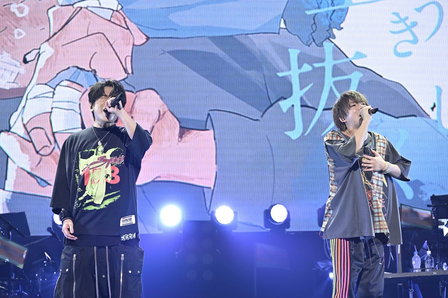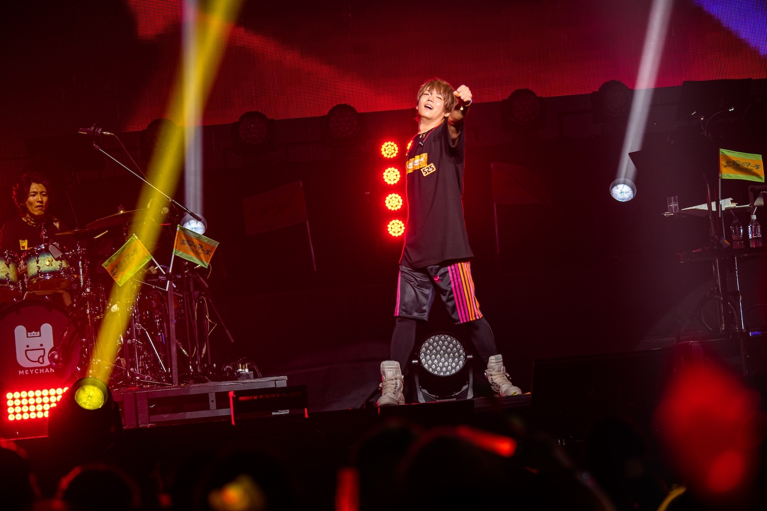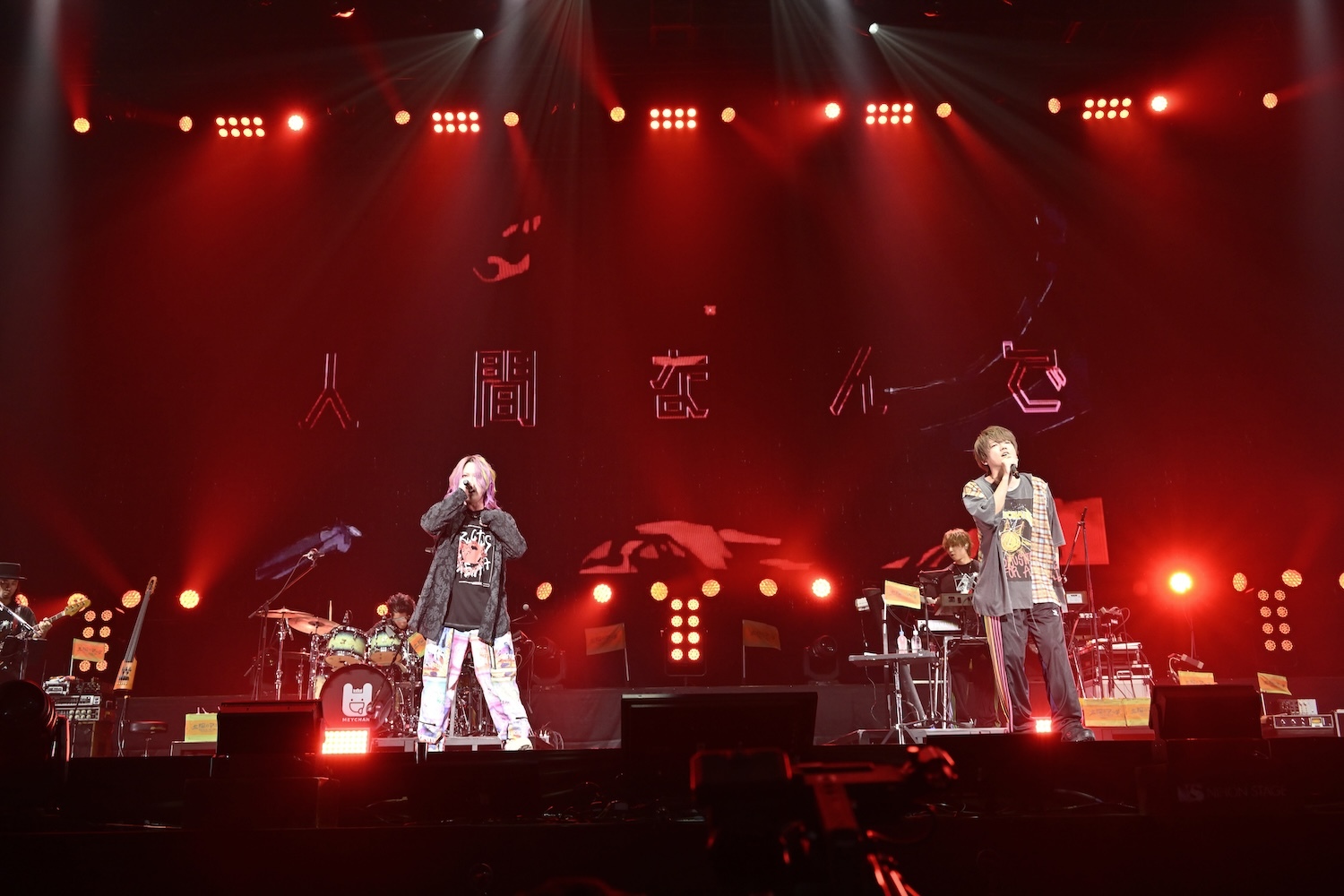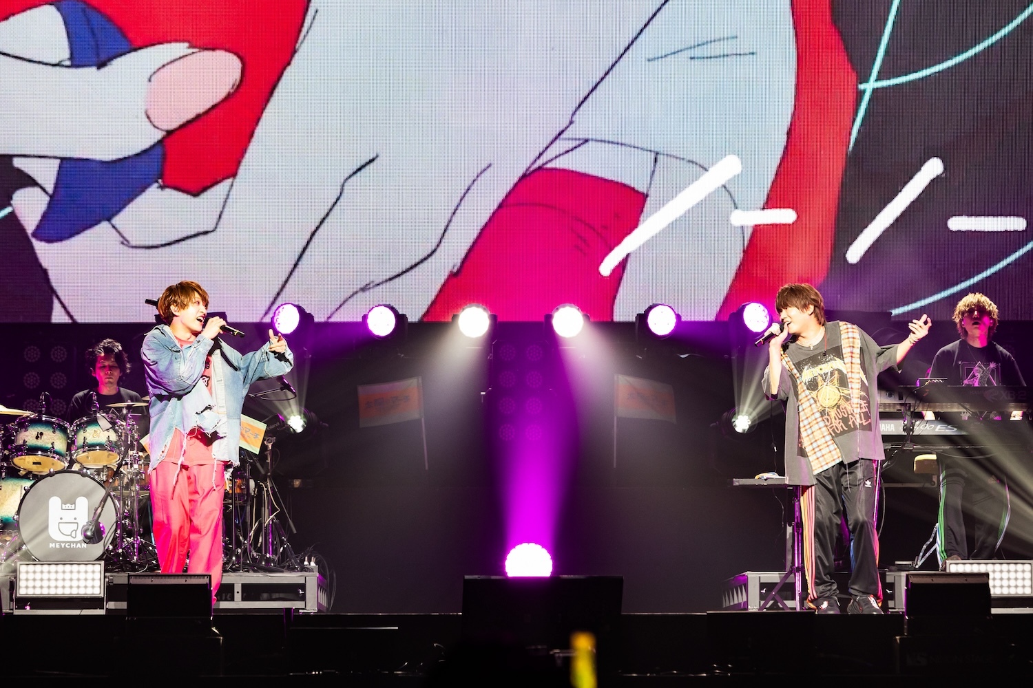 この後、ステージにはあらきが呼び込まれ、彼のソロタイムに引き継がれる。あらきはパワフルなハイトーンボーカルで「ヒバナ」を披露し、ハードなパフォーマンスで挑発。その後はめいちゃんと「偽物人間40号」をコラボし、場内はあらきのイメージカラーの赤とめいちゃんカラーのオレンジで情熱的な空間に染まった。