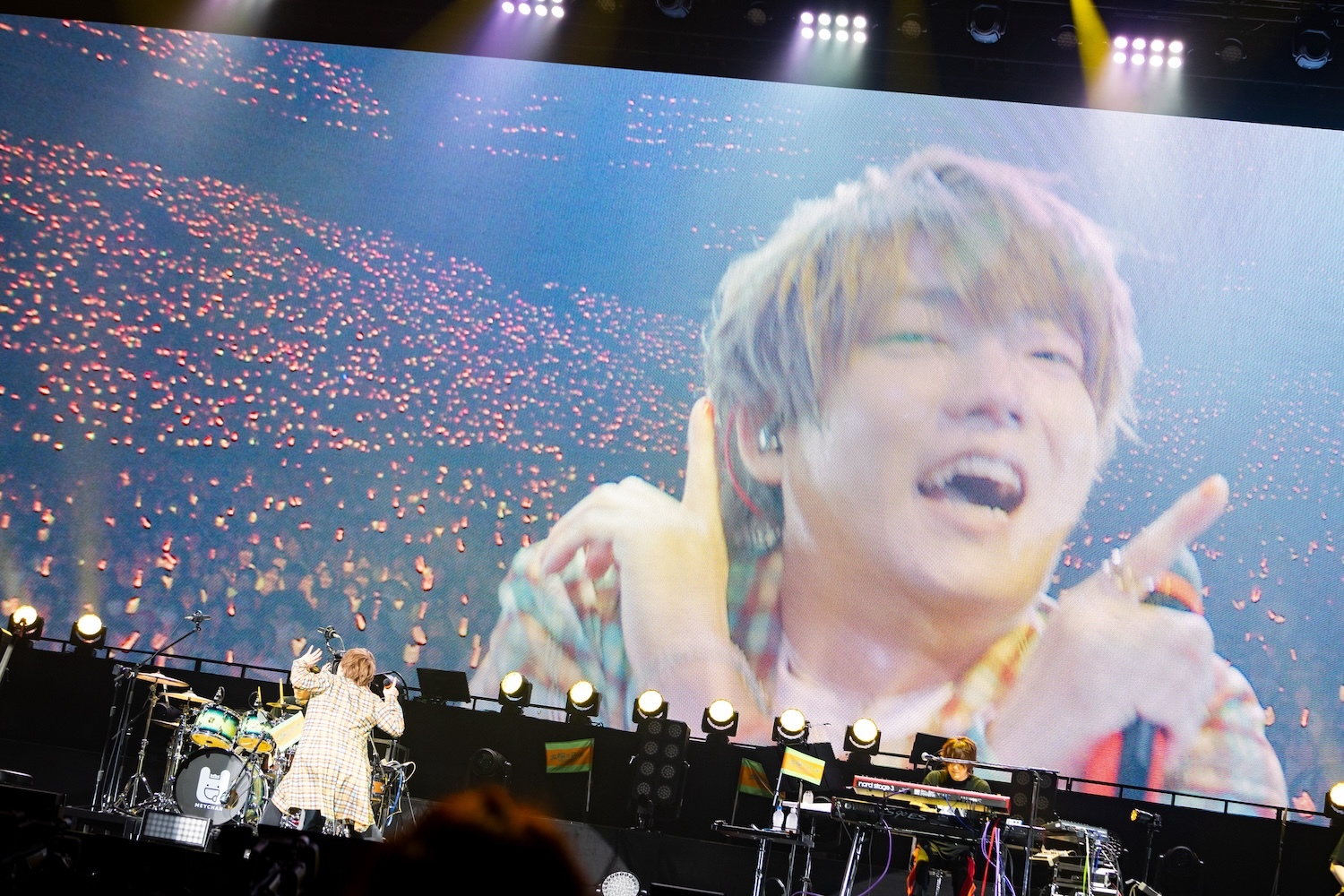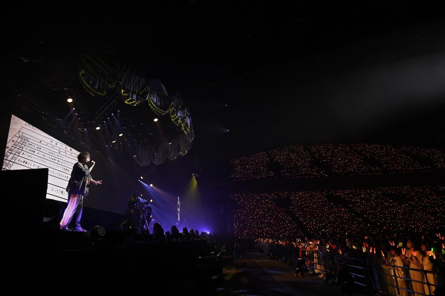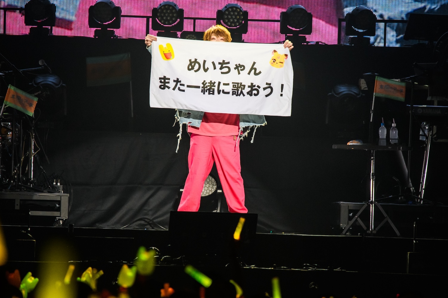 この後のMCでも、アリーナ席から全エリアの客席に向けて「行けるか~!」と喝を入れ、ここで最初のゲスト、センラを呼び込む。会場のペンライトはめいちゃんカラーのオレンジと、センラのイメージカラーのイエローが同時に点灯し、ふたりで「ジャンキーナイトタウンオーケストラ」を歌唱。息の合ったパフォーマンスはさすがだ。曲が終わると、めいちゃんはセンラに任せステージをあとに。このソロタイムにセンラは「脳内シェイカー」でグイグイ盛り上げる。彼の出番がそろそろ終わるかというタイミングで、なぜかスタッフがセンラにタオルを渡す場面が……。場内が“ん?”となったところでセンラがタオルを広げると、そこには“めいちゃん また一緒に歌おう”という文字が! めいちゃんを温かく送り出したいというセンラ流のサプライズだった。