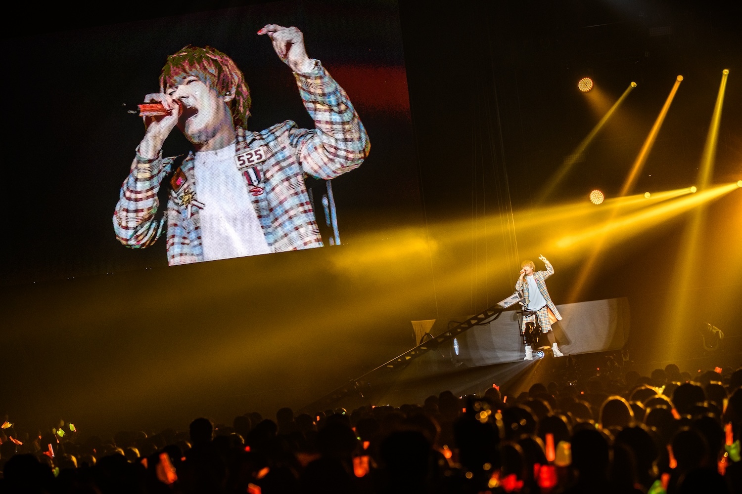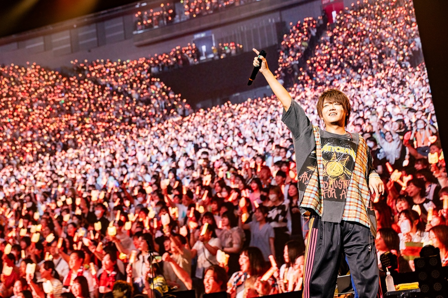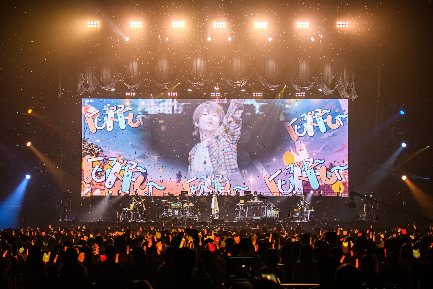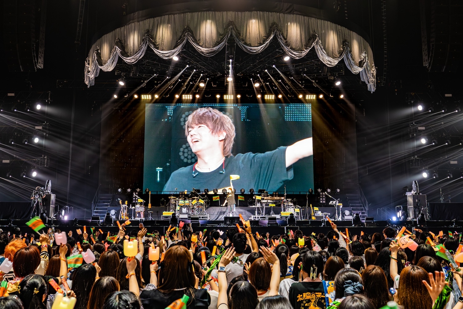 この後のMCでも、アリーナ席から全エリアの客席に向けて「行けるか~!」と喝を入れ、ここで最初のゲスト、センラを呼び込む。会場のペンライトはめいちゃんカラーのオレンジと、センラのイメージカラーのイエローが同時に点灯し、ふたりで「ジャンキーナイトタウンオーケストラ」を歌唱。息の合ったパフォーマンスはさすがだ。曲が終わると、めいちゃんはセンラに任せステージをあとに。このソロタイムにセンラは「脳内シェイカー」でグイグイ盛り上げる。彼の出番がそろそろ終わるかというタイミングで、なぜかスタッフがセンラにタオルを渡す場面が……。場内が“ん?”となったところでセンラがタオルを広げると、そこには“めいちゃん また一緒に歌おう”という文字が! めいちゃんを温かく送り出したいというセンラ流のサプライズだった。
