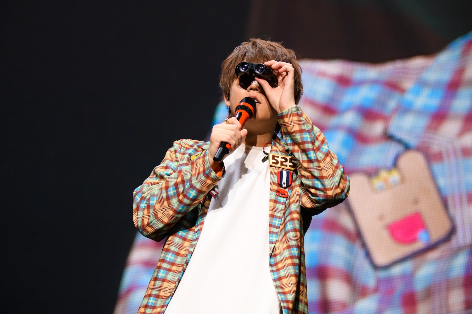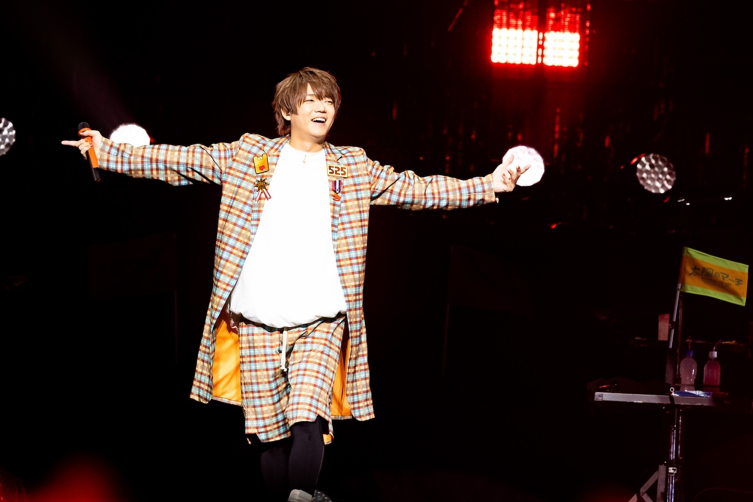 開演時間となり、照明が落ちるとめいちゃんカラーのオレンジの照明が会場を照らす。ステージを覆っていた緞帳が上がり、弦楽器の穏やかなSEが流れると同時にスクリーンにはアニメーションのオープニングが流れ始めた。絵本から始まり、青空を飛んでいく鳥の背景には太陽が現れ、まるで太陽の街に迷い込んだような世界に誘われていく。そして画面に“太陽のマーチ”の文字が現れると、場内からは大きな拍手が起こった。映像の世界に引き込まれた直後、オープニングナンバーの「パンダヒーロー」で、会場は一気にフルテンションへ! 今回のアリーナツアーのキービジュアルと同じチェック柄のセットアップ衣装で登場しためいちゃんは「見せてくれ、さいたま!」と、観客をさらに鼓舞。2曲目にも必殺ナンバー「エンジョイ」を投下。攻めの曲順で、はずみをつける。
