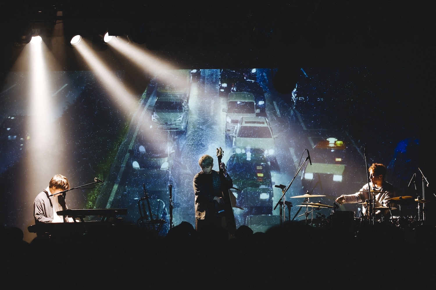スクリーンに映し出されたライブスタートまでのカウントダウンが0になり、観客から大きな拍手で迎えられたライブは幕を開け、カワイヒデヒロ(B)の安定したベースラインと井上司(Dr)のアグレッシブルなドラミング、そして岸本亮(Key)の美しい旋律を奏でるピアノサウンドが一体となり、さっそくオーディエンスをライブの世界観に引き込んでいくと、観客はボルテージを高めていく。