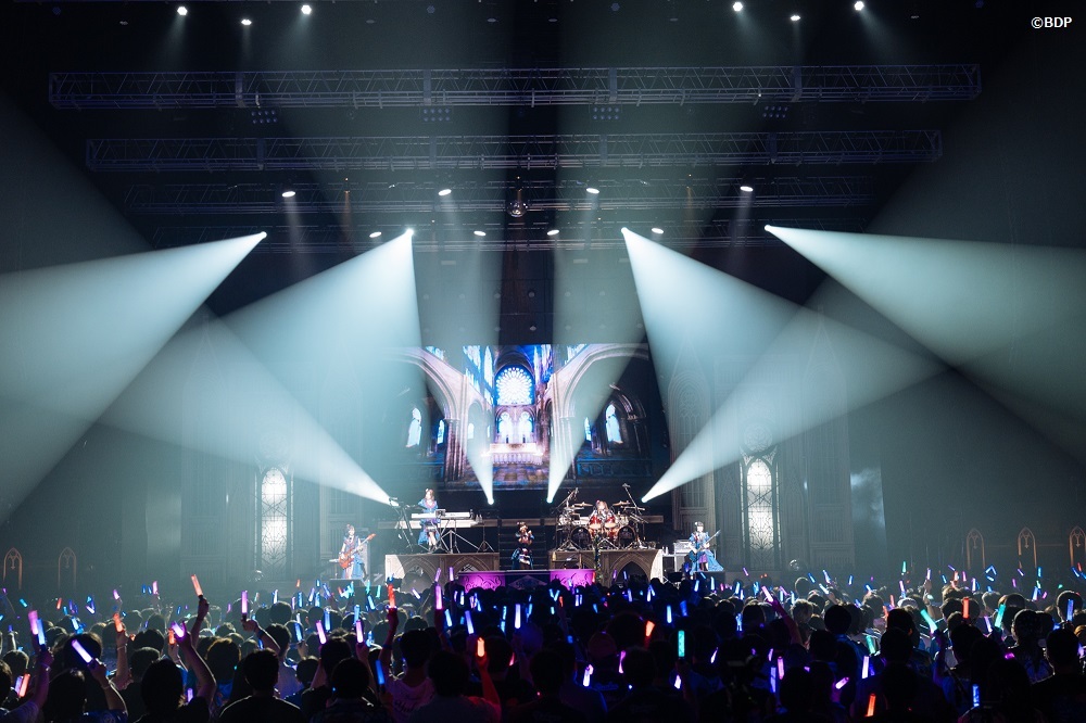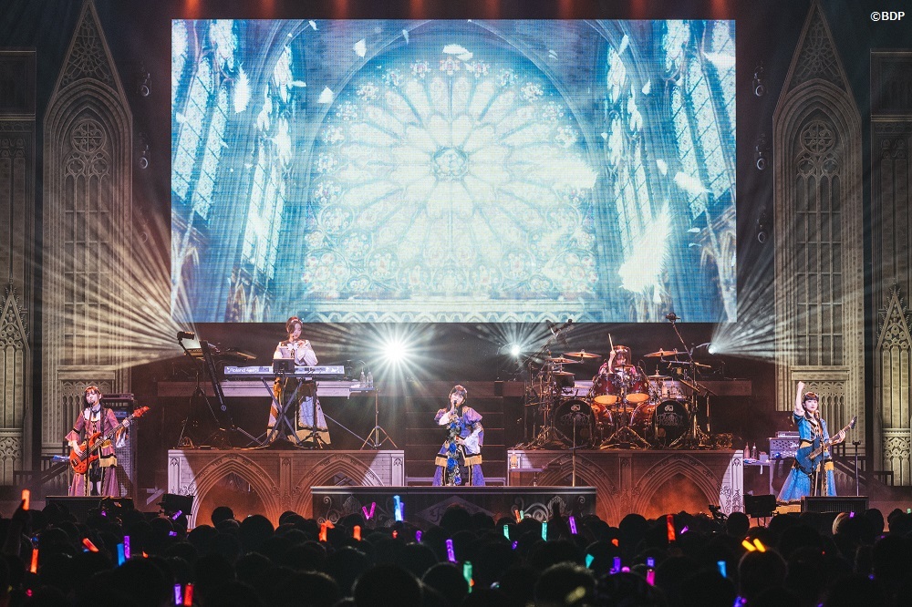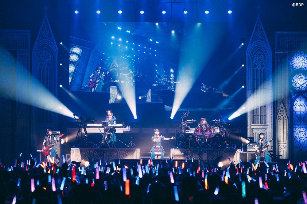 紗夜が登場し、ギターソロを披露すると、一気に会場はターコイズブルーに染まる。今回のツアーの衣装に着替えたメンバーも姿を現し、「THE HISTORIC…」へ。