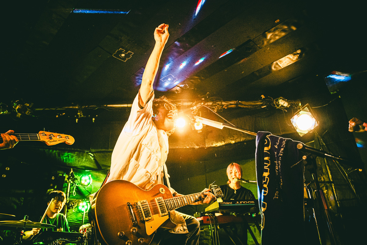 荒川を鼓舞するようにキメを重ねながら、バンドの演奏が白熱し、<だけど僕は誰のために生きてるんだろうか>という荒川の熱唱が観客の胸を打つ。そして、荒川は観客の気持ちをさらにかき乱すようにバリバリと歪ませた音色でギターソロをかき鳴らしたのだった。今年4月に『SCREW』をリリースして、ようやくプロのミュージシャンとしてスタートラインに立てたという気持ちがあるのだろう。