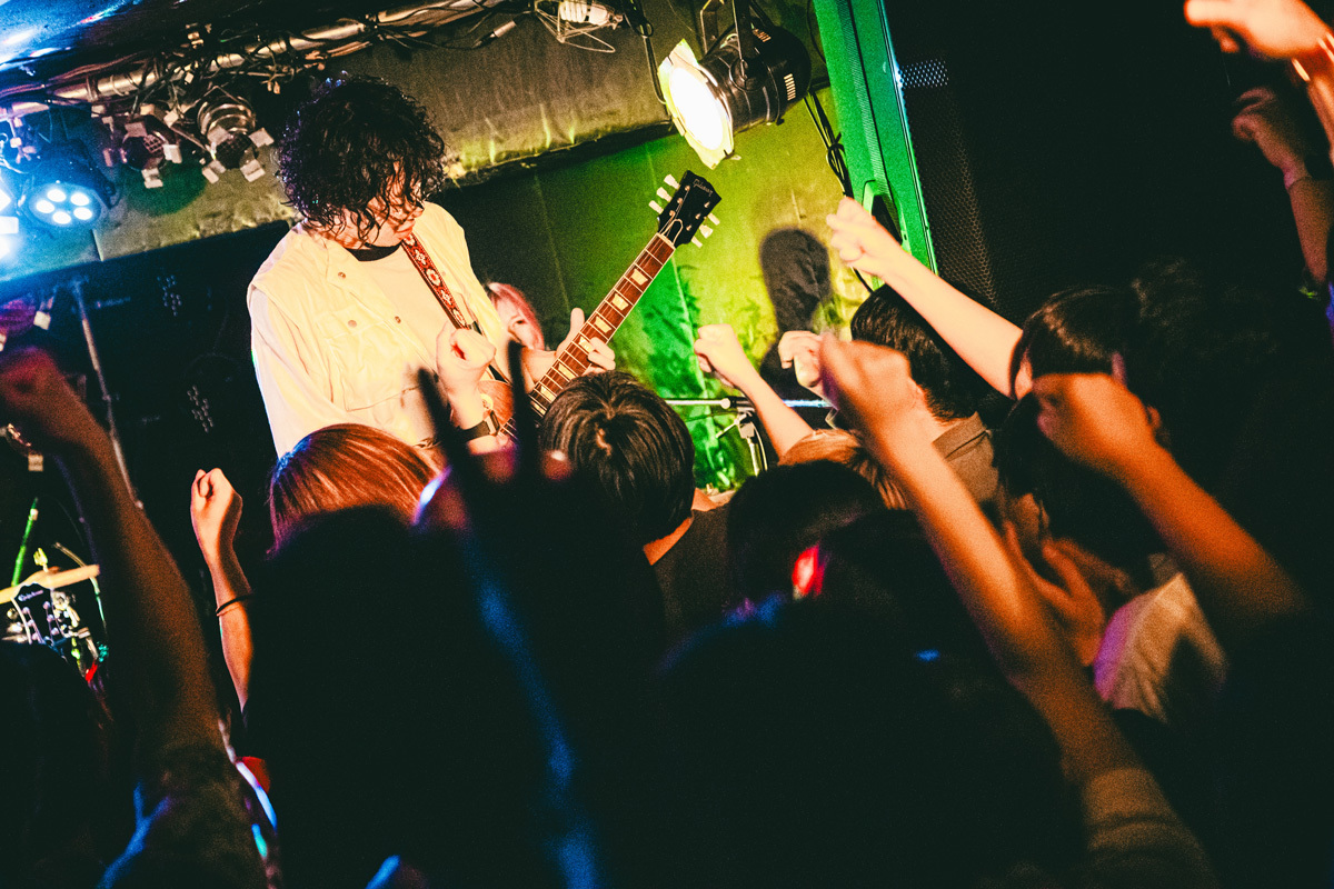 ギターをかき鳴らしながら、シャウトするように歌い、時折、雄叫びをあげる荒川はエネルギーの塊そのものだ。筆者がインタビューした時の伏し目がちに言葉を選びながら語る思慮深い青年という印象はこの日、一瞬で吹き飛んだ。ステージとスタンディングのフロアの間にある柵の上で荒川がギターソロをキメると、今度は観客が鬨の声をあげる。