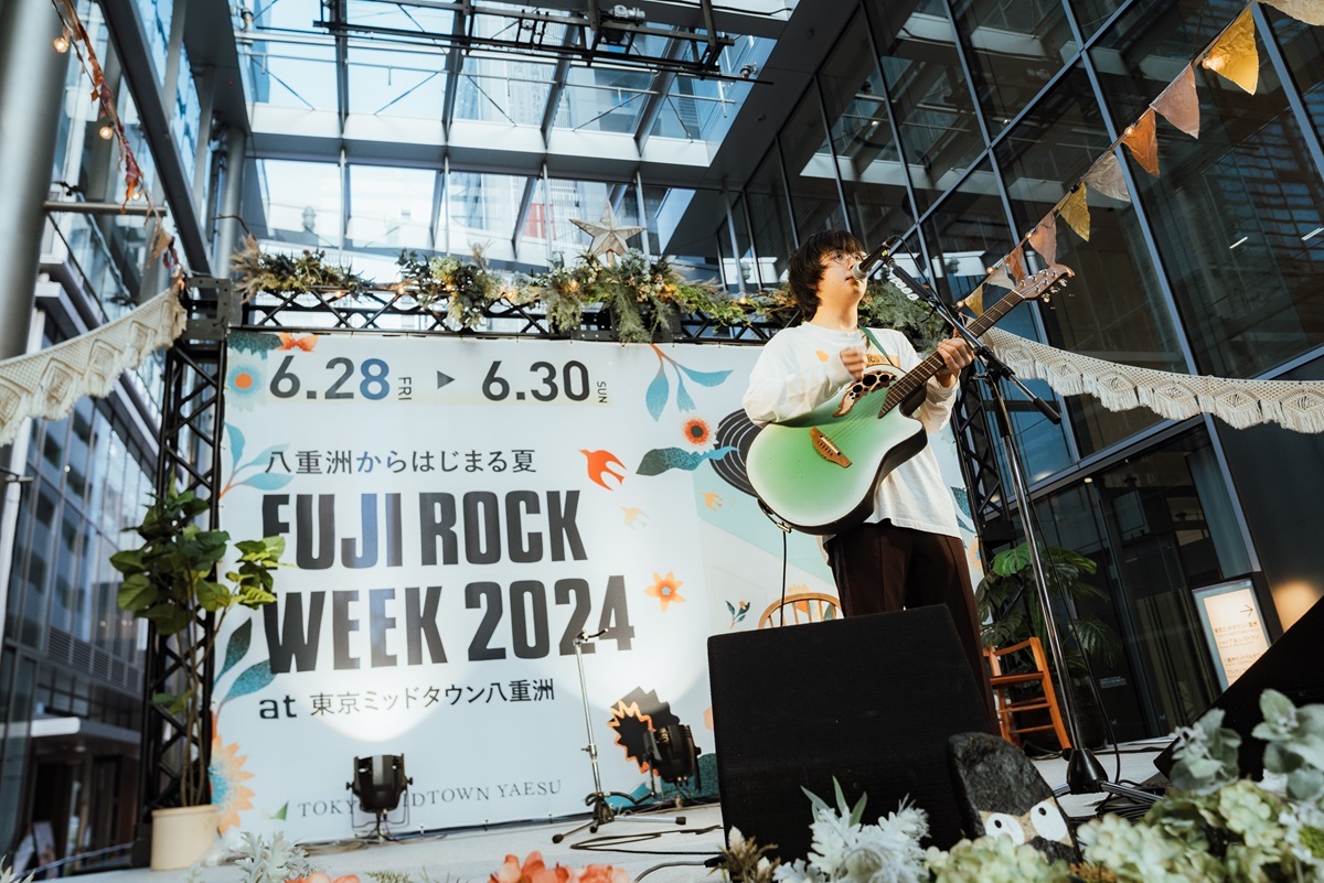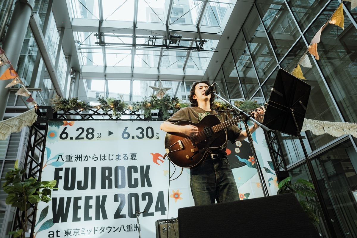 ザ・キラーズ(THE KILLERS/26日)、クラフトワーク(KRAFTWERK/27日)、ノエル・ギャラガーズ・ハイ・フライング・バーズ(NOEL GALLAGHER’S HIGH FLYING BIRDS/28日)をヘッドライナーに迎え、7月26日(金)、27日(土)、28日(日)に開催される『FUJI ROCK FESTIVAL’24』(以下、フジロック)。そんな『フジロック』をひとあし早く体感できるプレイベント『FUJI ROCK WEEK 2024 at 東京ミッドタウン八重洲』が、6月28日から30日の3日間にわたって開催されました。『フジロック』にゆかりのあるアーティストによるフリーライブをはじめ、深夜まで踊り明かすDJイベント、実際に会場でも開催されるワークショップなど、来場者が参加できるコンテンツが盛りだくさん用意され、連日多くの人々で大盛況! ここではイベント全体の様子を駆け足でお届けします。