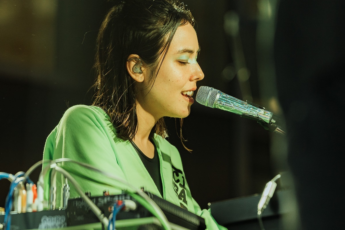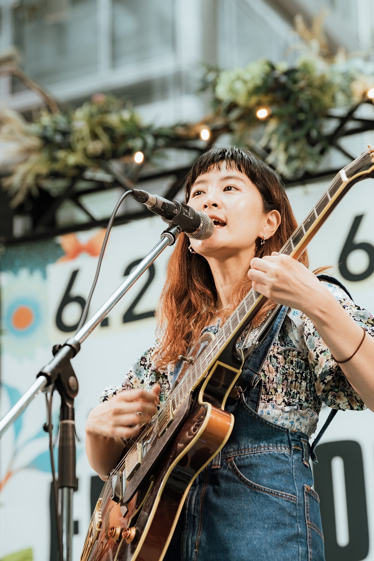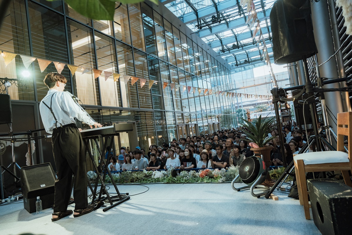 筆者が訪れた2日目の夕暮れ時にライブエリアのあるガラスに囲まれた空間で響いていたのは、崎山蒼志のジェントルで伸びやかな歌声でした。アコースティックギターの音色も、歌詞とメロディとがスッと心に入りこんでくるような感覚も心地好く、穏やかで贅沢なひとときはあっという間に終演に。詰めかけた来場客から心を満たしてもらった感謝ともとれる拍手が送られると、それに応える形で再登場してアンコールを披露。アーティストと観客との距離感も絶妙によくて、ライブで得られる多幸感てこれだよなあと人知れず頷いていました。