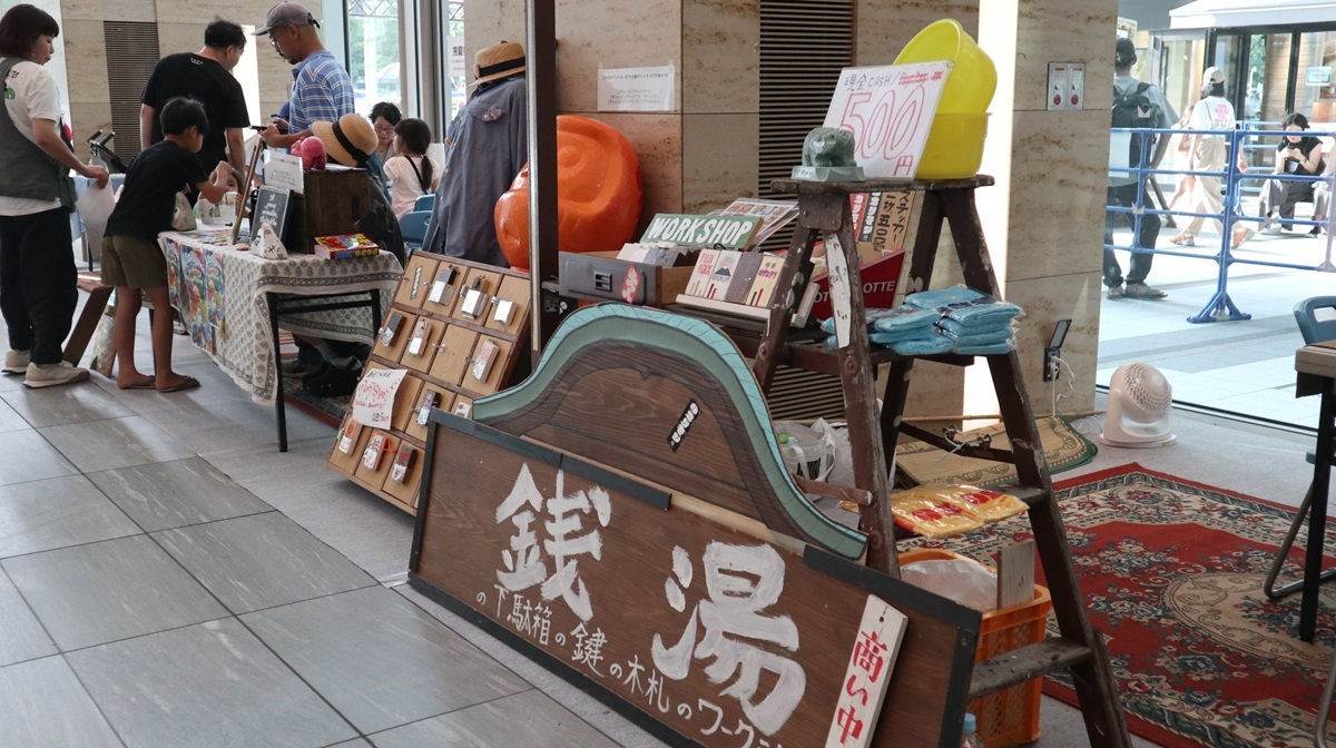 イベントは1階のガレリア・アトリウムと、2階のヤエスパブリックの2ヵ所で展開され、1階ガレリア・アトリウムには『FUJI ROCK FESTIVAL’24』と書かれた巨大な入場ゲートがどっしりとお出迎え。その両サイドには「GREEN STAGE」や「WHITE STAGE」「RED MARQUEE」といった『フジロック』の名シーンが生まれたステージの名前入り道先案内板がズラリと掲げられています。フリーライブエリアにはそのゲートをくぐって入るのですが、そこでは『フジロック』の入場ゲートをくぐる時に似たワクワク感を感じられ、胸が高鳴る体験も。また、奥にあるステージへと続くガーランドや、苗場を感じさせるアート作品などのデコレーションもフジロックテイストを程良く演出していて、近未来感の漂うアーバンシティにおいて苗場のいい風を吹かせるのに一役買っていました。