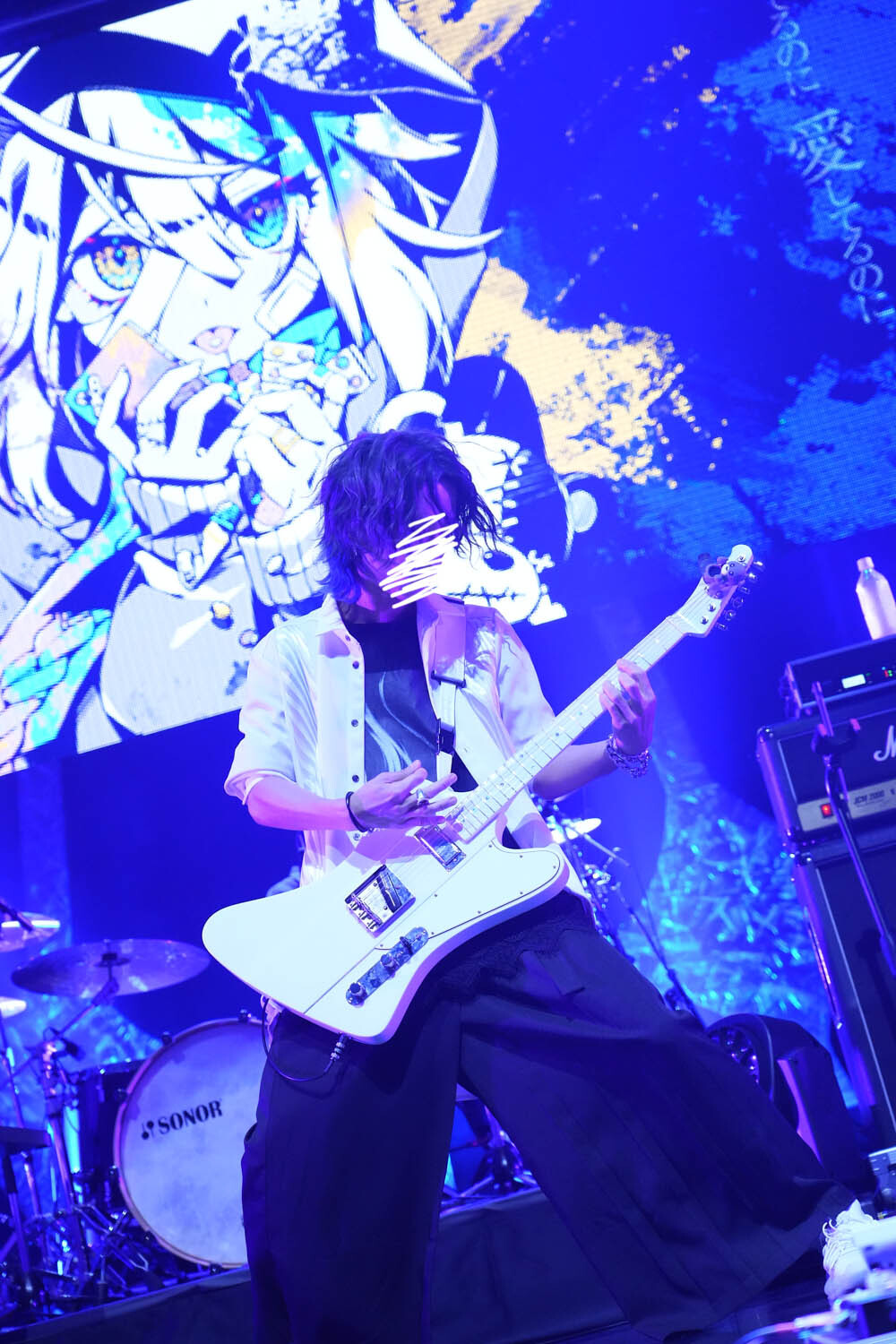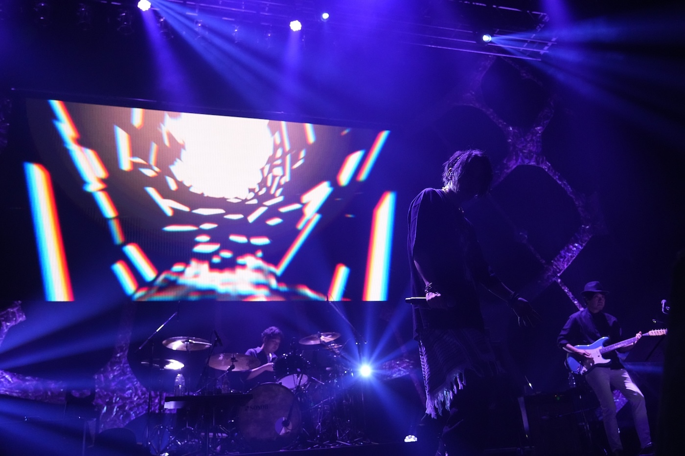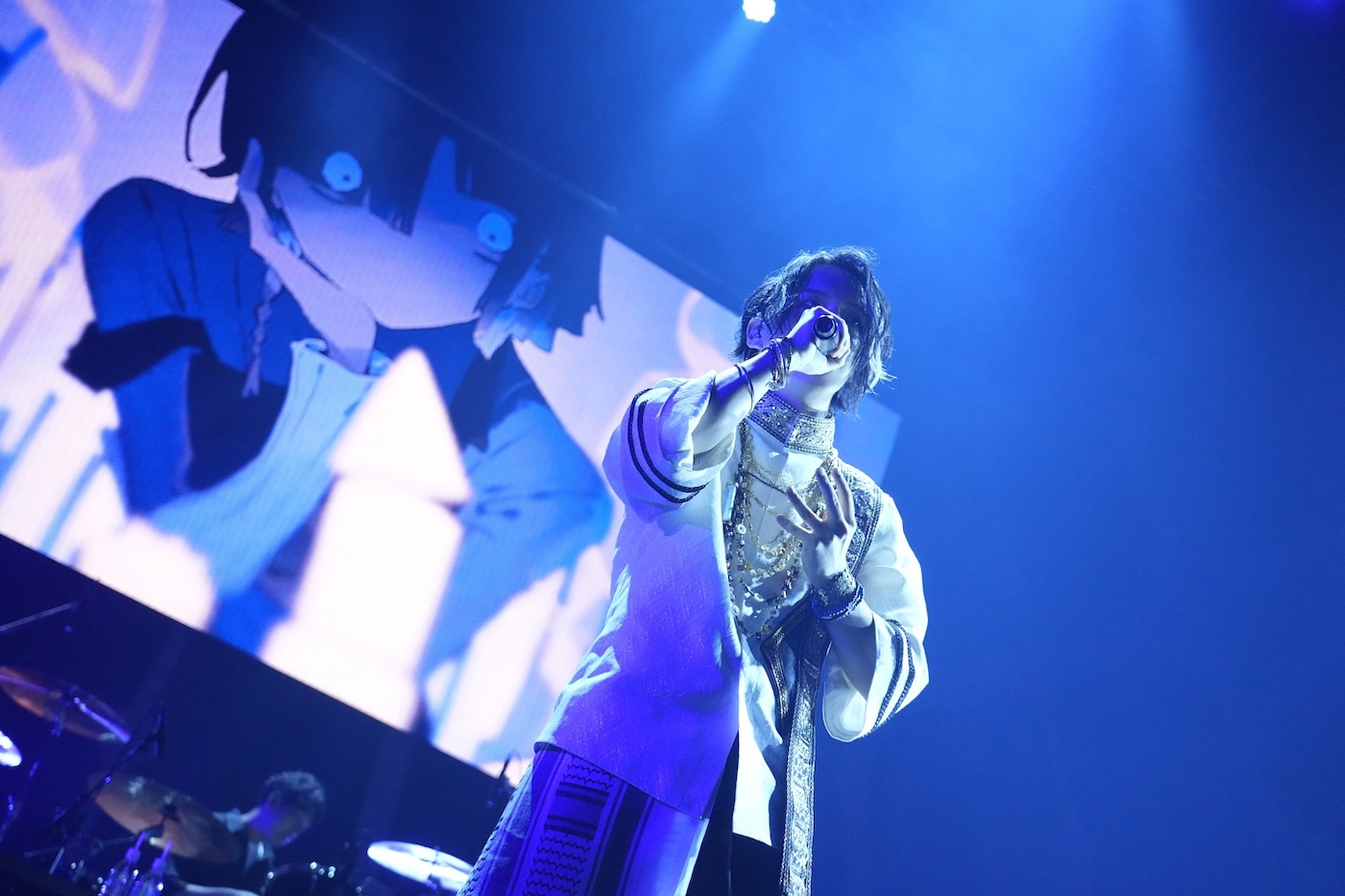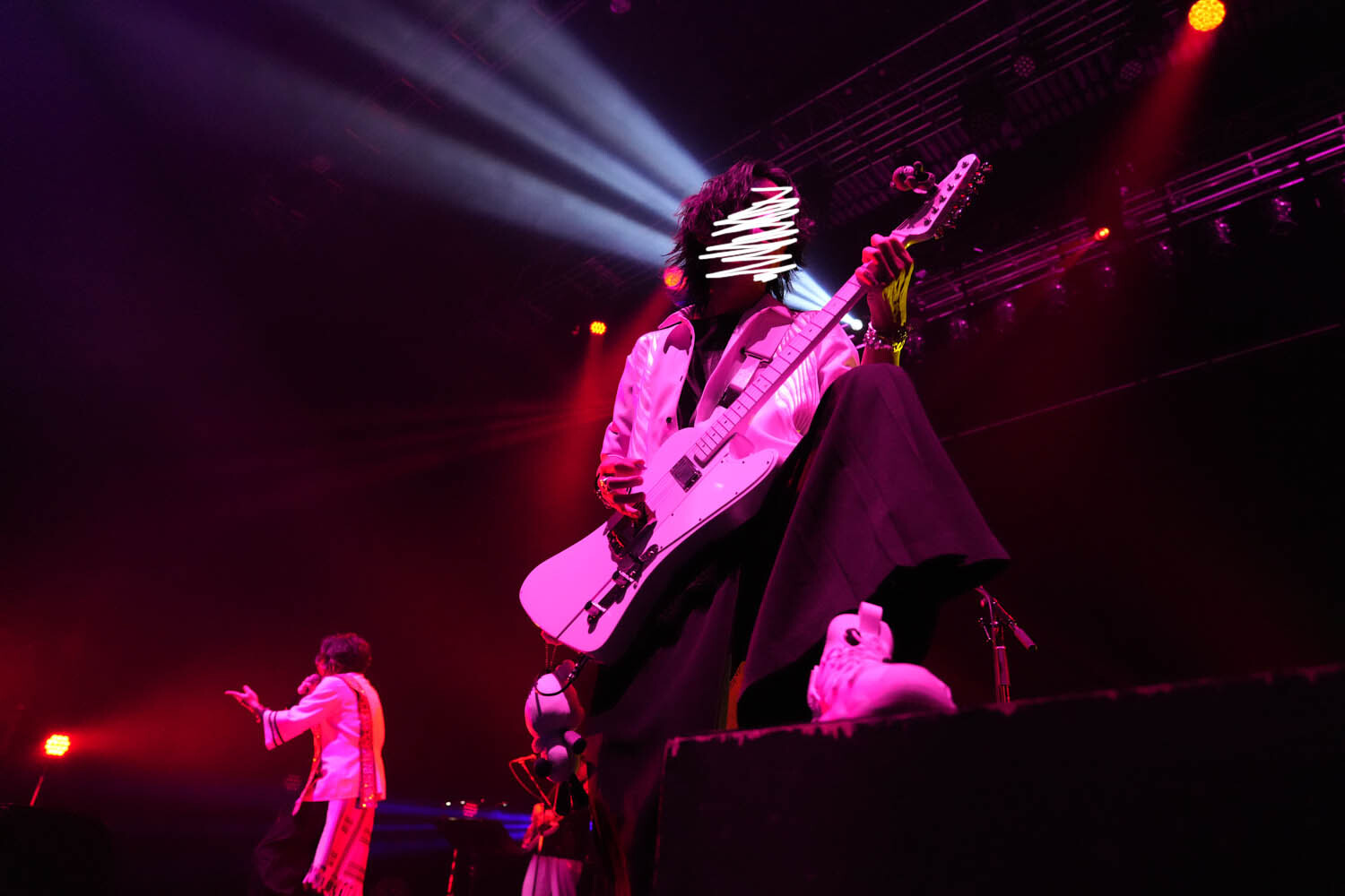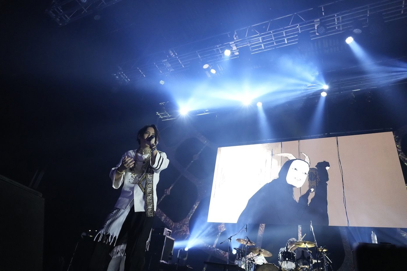 seeeeecunを送り出すと、その熱狂を膨らませるように、ライブは「ヲズワルド」から後半戦へ。宮下は、退廃的なサウンドの中で激しく動き回る歌唱難易度激ムズのメロディをサラリと歌い、曲の後半では壮絶なロングトーンのシャウトを轟かせてフロアを驚愕させると、全編通して強烈なメランコリーが立ち込める「-[REJOICE]-」を、柔らかくも美麗な声で歌い上げた。そして、本編ラストナンバーとなる「デウスエクスマキナ」へ。前述の「メリッサ」同様、サイバーパンクテイストなこの曲も、ライブで体感すると凄まじい重量感。照明が凄まじく明滅する中、宮下は鬼気迫る声で絶唱し、ステージを後にした。