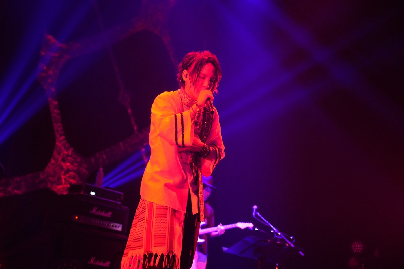この日のセットリストは、ダークファンタジー色の強いアレンジでディープな世界へ誘なう「夜の積み木部屋」や、原曲ではハードなシンセ音がゴシックでデカダンな香りを強烈なものにさせていたが、ライブで体感するとギターサウンドが前に出ていて、かなりヘヴィな手触りになっていた宮下の自作曲「メリッサ」など、昨年12月に発表した5thアルバム『白雨の下』の収録曲を中心にしつつ、そこに過去の楽曲を組み込んでいくというもの。イントロのオルゴールが流れた瞬間に大歓声が上がったのは、「愛して愛して愛して」。サビの前半では狂気的に咆哮すると、後半では圧巻のファルセットを響かせた。