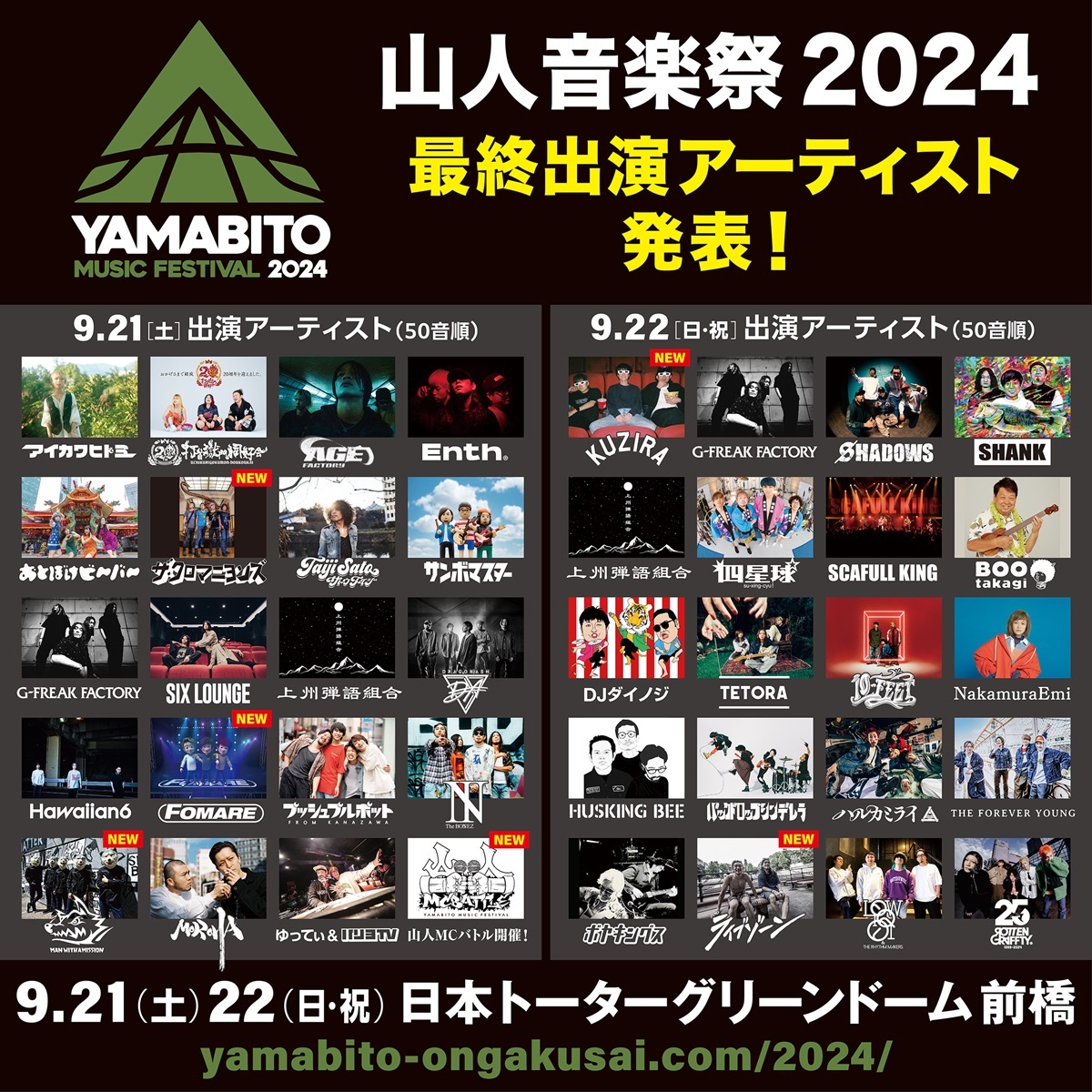 群馬出身・在住のロックバンド、G-FREAK FACTORYが主宰するロックフェス『山人音楽祭2024』の最終出演アーティストが発表された。