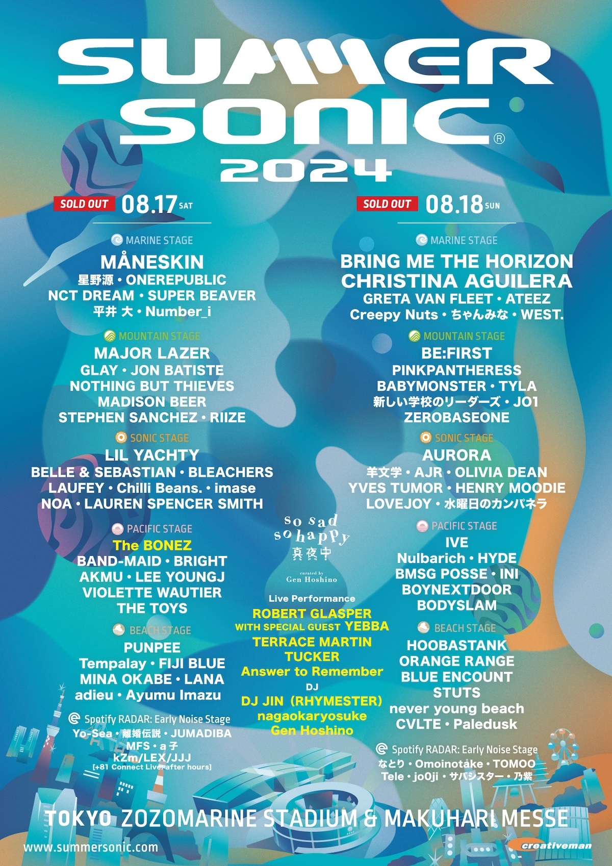 そして、8月17日(土)東京公演深夜の『MIDNIGHT SONIC』においては、昨年に引き続き星野源が深夜のSONIC STAGEを丸ごとキュレーション。『“so sad so happy 真夜中” Curated by Gen Hoshino』と銘打ち、豪華な出演者が真夜中の幕張に集結する。