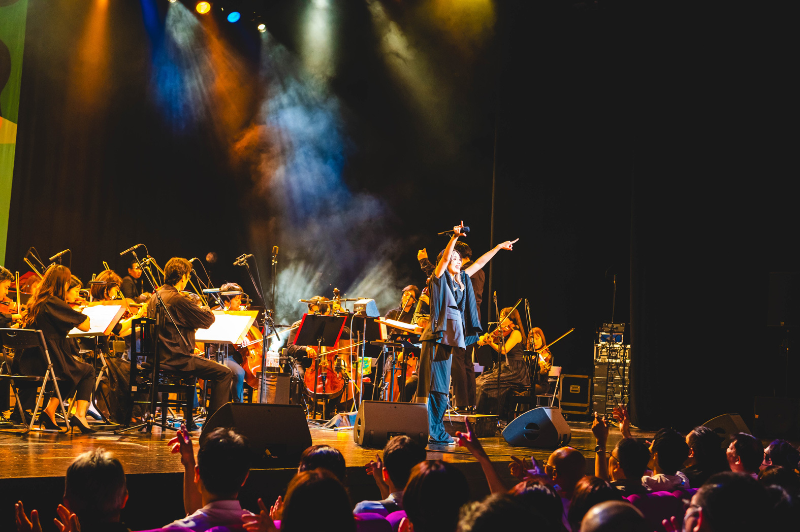 「今伝えたいメッセージが詰まった曲」という言葉が添えられた「CRAZY WORLD」はダイナミックでパワフル。<狂ってるこの世界に僕は飲み込まれない>というパンチラインや早口ボーカルが、オーケストラの波に乗って力強く届いてくる。芸術性の高い「Tranquility」を経て、2度目のオーケストラメンバーとのMCでは、今回初参加となる、コントラバスの石川徹とバイオリンの萩原合歓(ねむ)、パーカッションの鰐渕陽介に楽器歴などを聞き、「これからもよろしくお願いします!」と絆を深める。