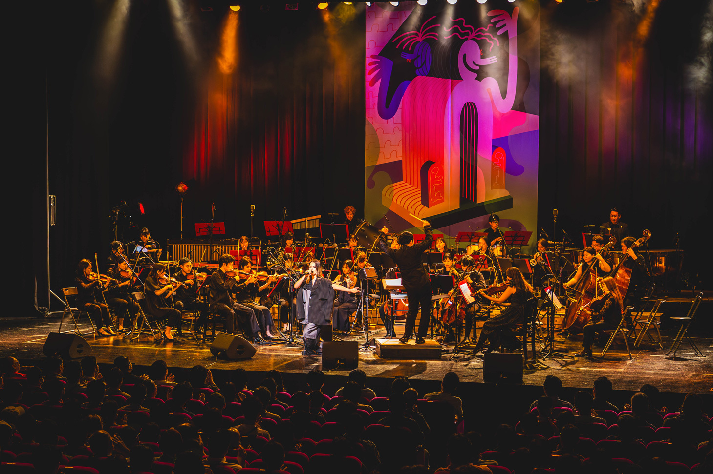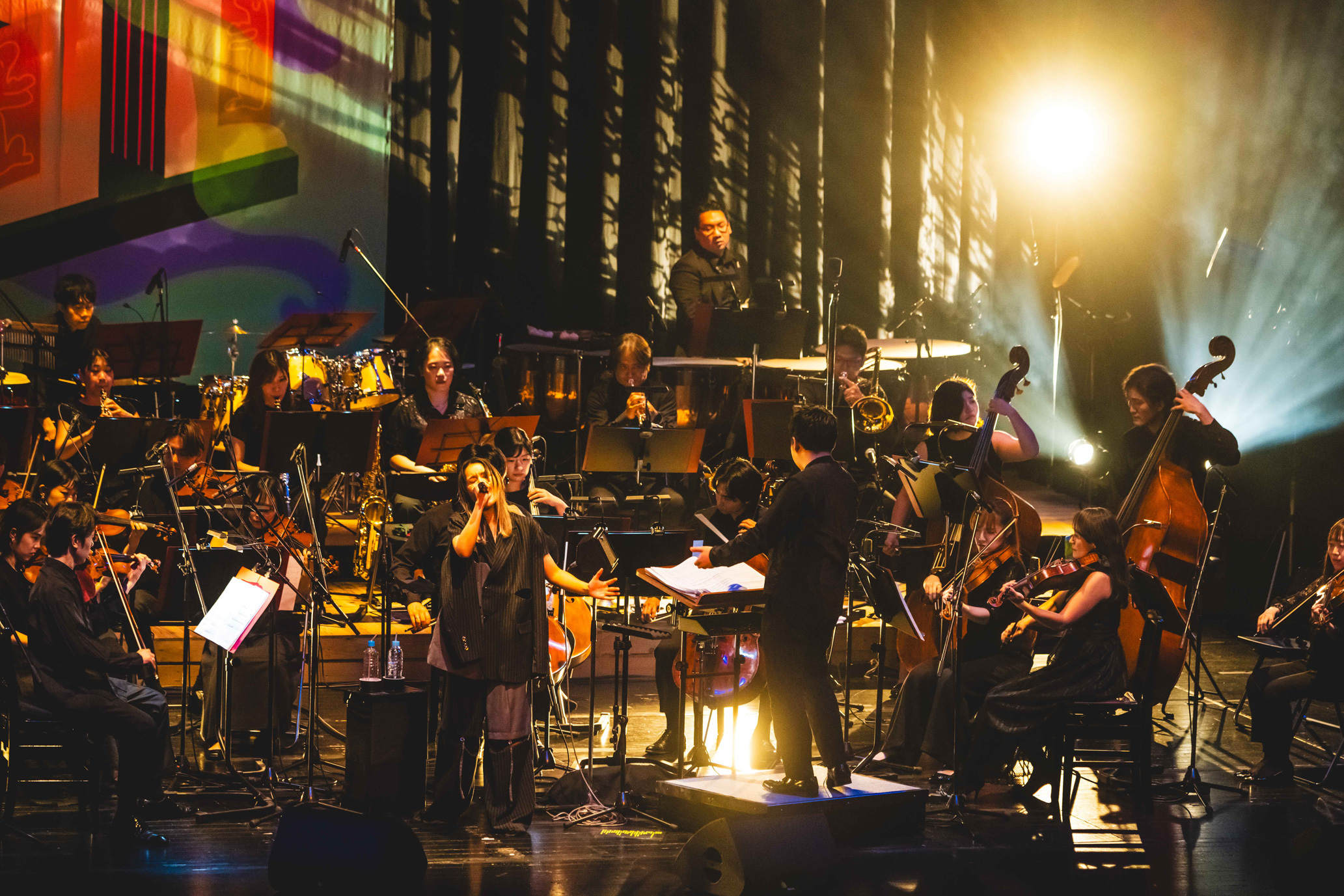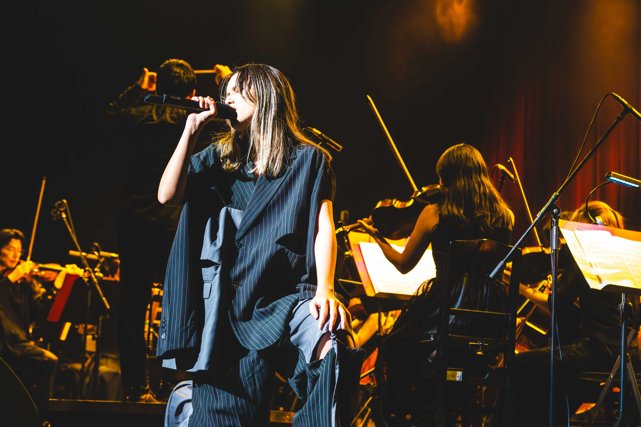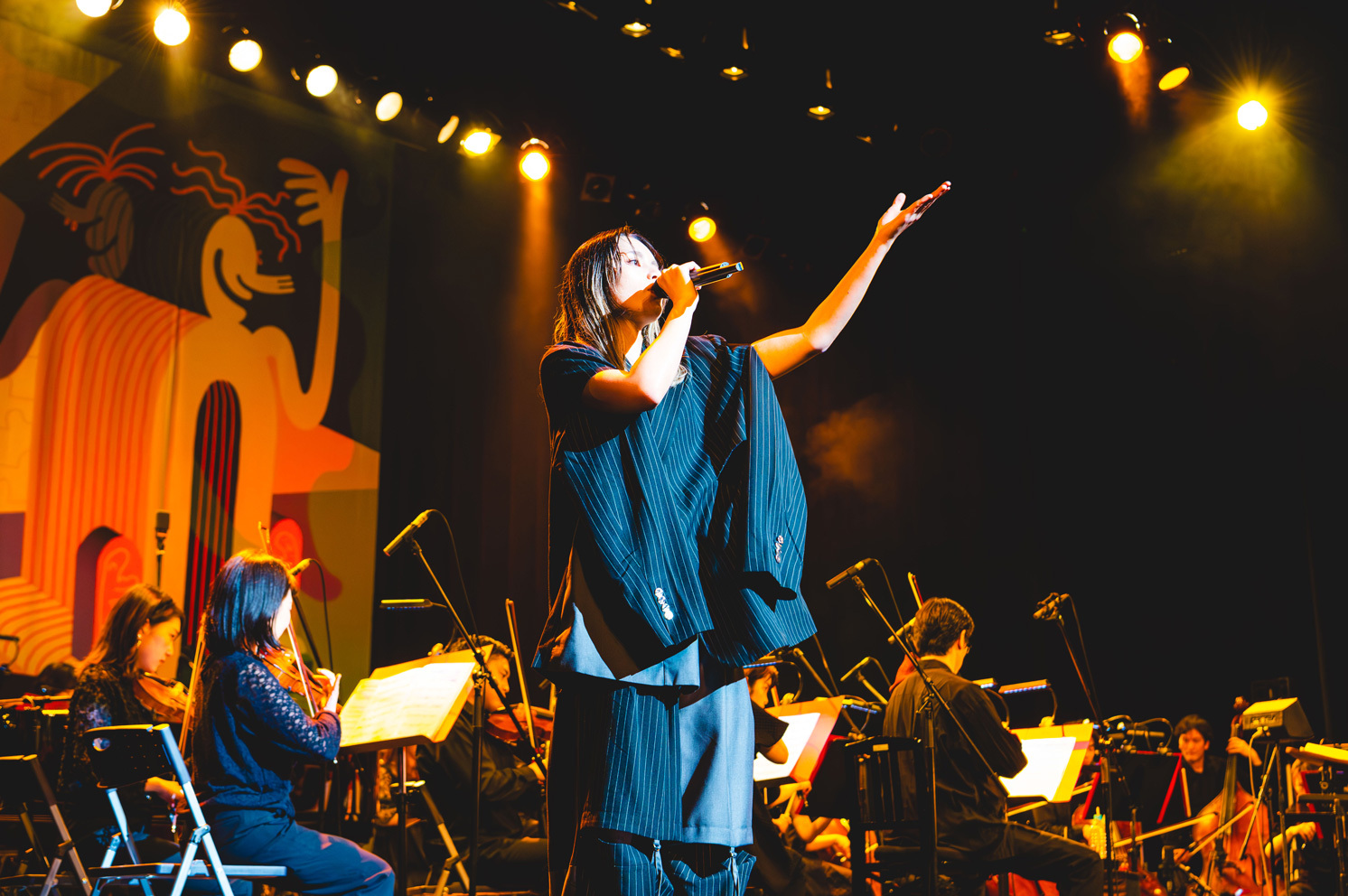 そして前回もアレンジがカッコ良いと評判だった「KAKKOII」。前回はバイオリンがイントロを担ったが、今回は木琴が担当。丸い音の粒が、軽やかに空間を跳ねていく。この曲最大の見せ場は、オーケストラメンバーによる足踏み&クラップだ。通常のオーケストラでは観られない迫力の演出に、客席も歓喜してクラップで応える。サックスやホーン隊、ピアノによるジャジーで渋いアレンジは最高にカッコ良く、余裕を感じるAnlyの歌い方も最高だった。
