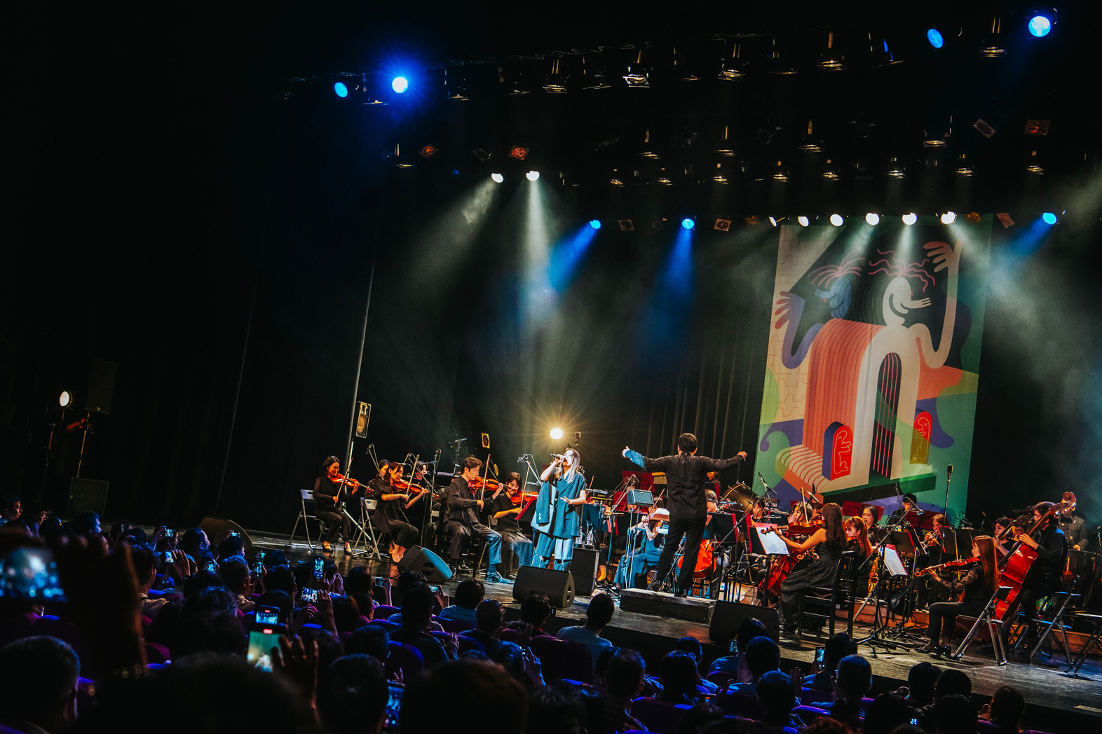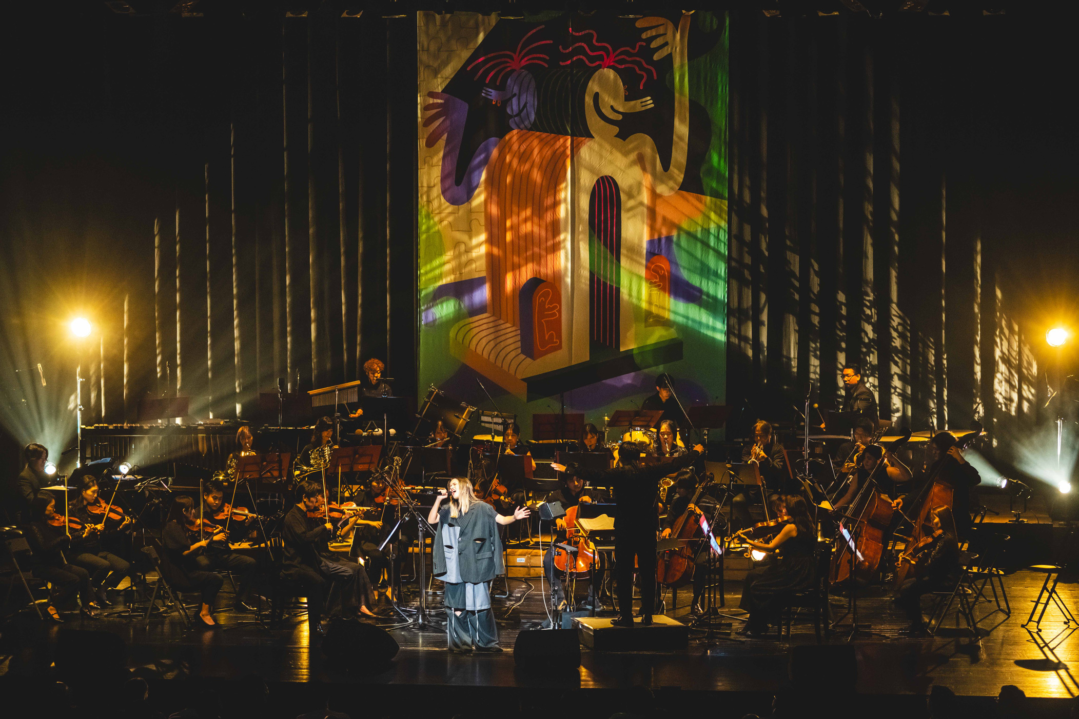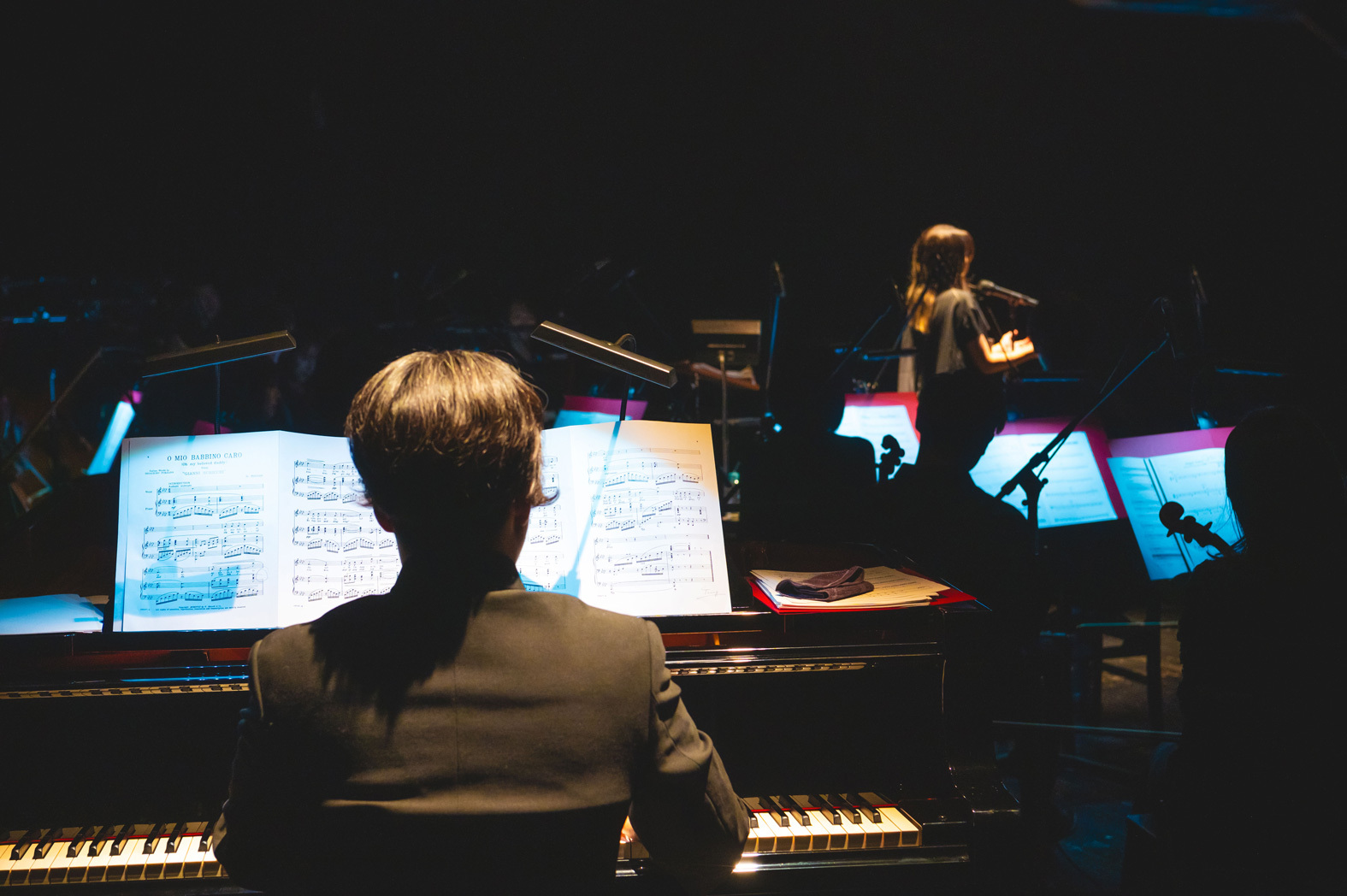 定刻になり、オーケストラメンバーがステージに上がる。コンサートマスターの西江辰郎が登場して音を出すと、空気が引き締まる。やがて指揮者でマエストロの米田覚士と、黒い衣装に身を包んだAnlyもスタンバイし、いよいよライブが幕を開けた。