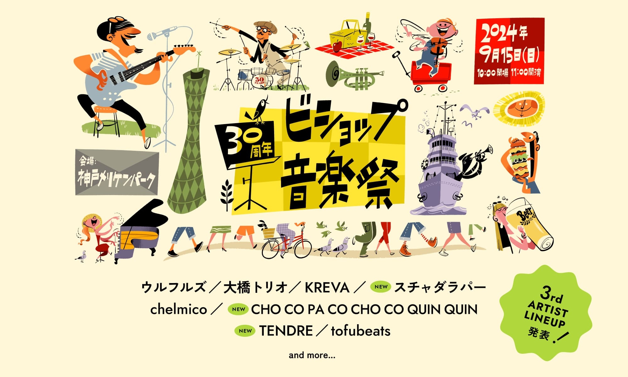 同イベントは、ビショップ創立30周年を記念して、地元神戸のメリケンパークを舞台に、音楽とファッション、ライフスタイルを楽しめる野外フェス。すでにウルフルズ、大橋トリオ、chelmico、KREVA、tofubeatsの出演が発表されている。