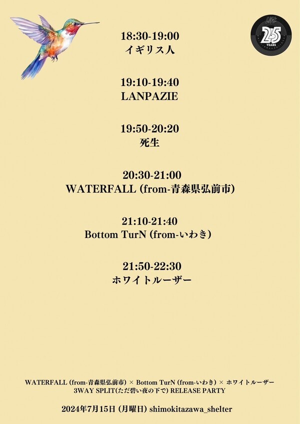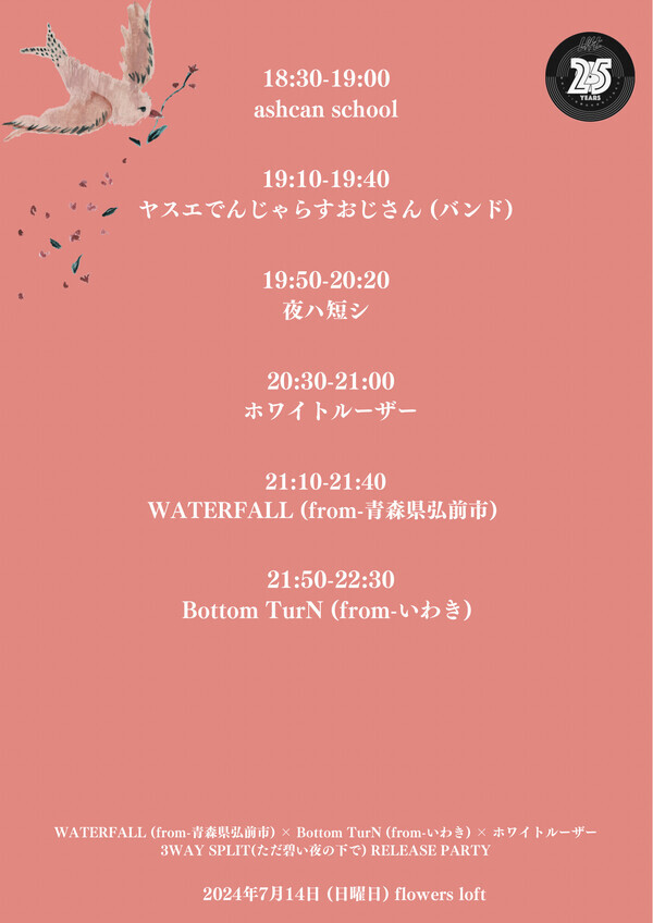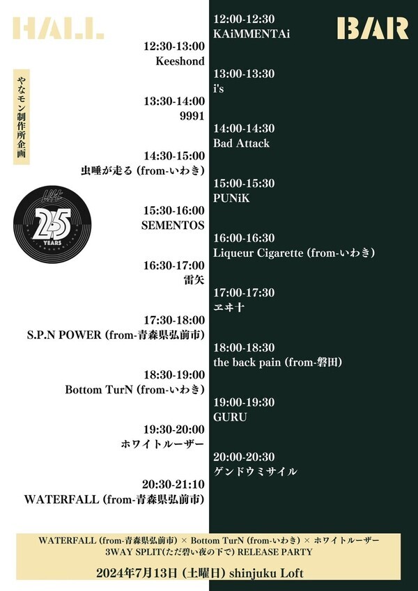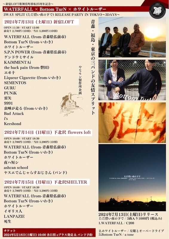7月13日(土)・14日(日)・15日(月・祝)には、同CDのリリースパーティー『WATERFALL×Bottom TurN×ホワイトルーザー 3WAY SPLIT(ただ碧い夜の下で)RELEASE PARTY IN TOKYO ~3DAYS~』が、東京の新宿LOFT・flowers loft・下北沢SHELTERの3会場で開催。新宿LOFTの歌舞伎町移転25周年を記念した同イベントには、WATERFALL、Bottom TurN、ホワイトルーザーを中心に、青森・福島・東京から多数のバンドが出演する。各日程の出演アーティストやタイムテーブルが公開中だ。