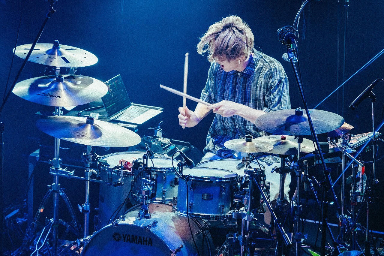 このセクションは、起承転結で言えば「転」のパート、1曲ごとに世界観がくるくる変わる。WATARUとSHUNがサンプラーを叩いて重低音をはじき出す「Chemical Heart」「One By One」は、いわばこの日のライブの最深部。EDMとアンビエント、暗さと激しさ、海の中でゆらめくような幻想的な照明。さらにHIROSHIがアコースティックギターを奏で歌う美しいバラード「Moment」へ、息を呑んで見つめるしかない展開が続く。シューゲイザーめいた轟音が、なぜか心を安らがせる。FINOの持つ世界観の多さと音像の深さは、ライブでこそよくわかる。